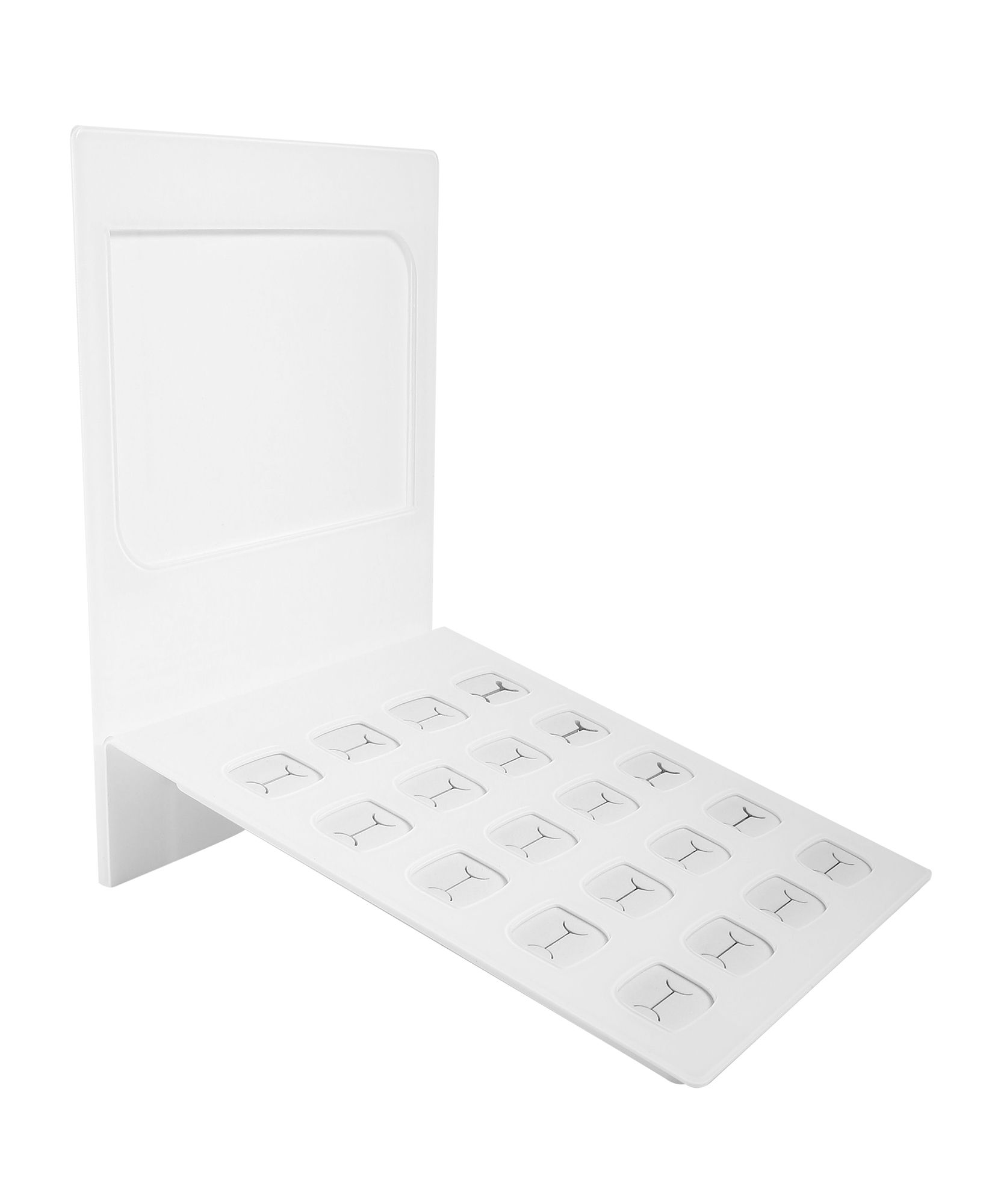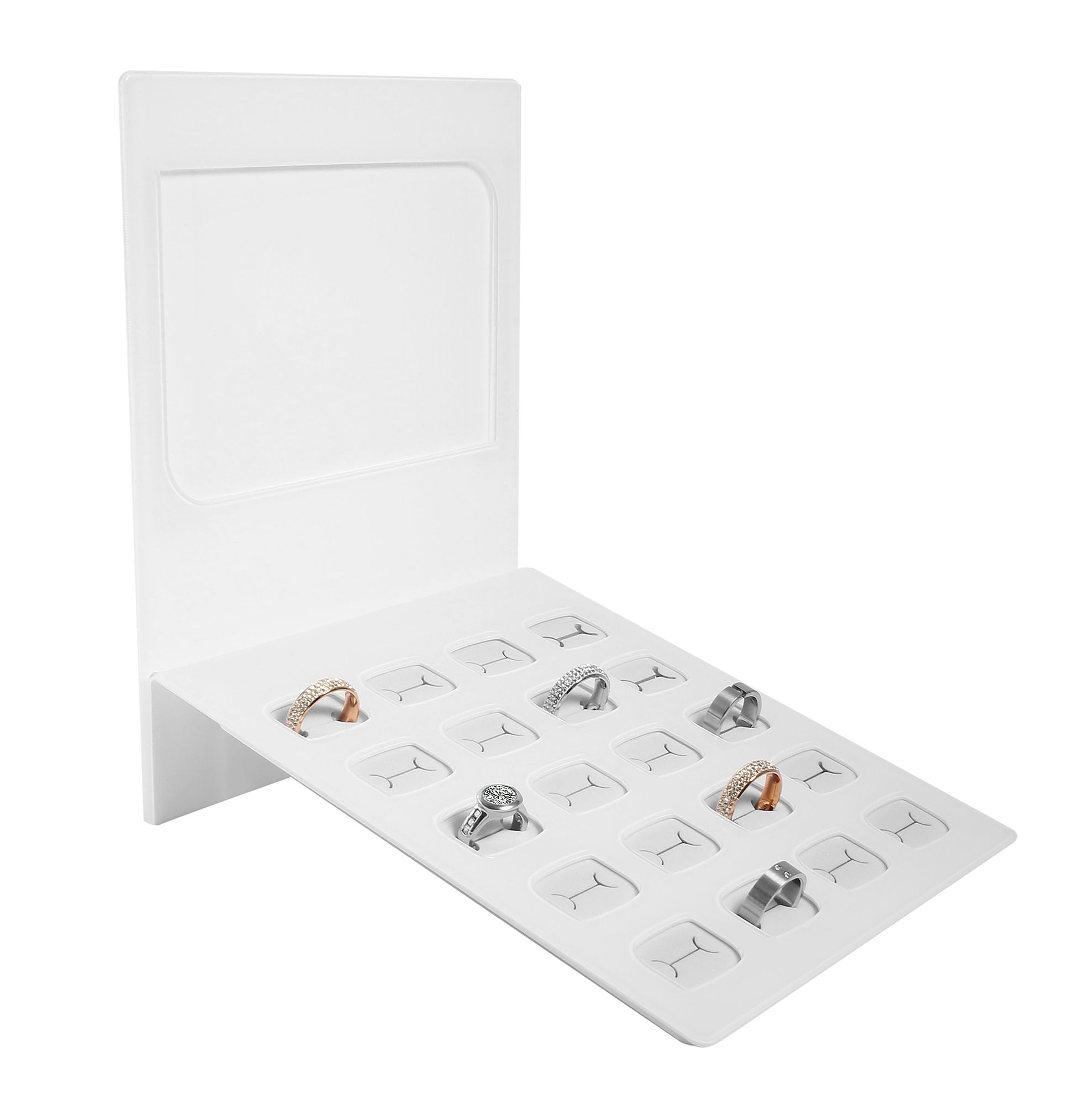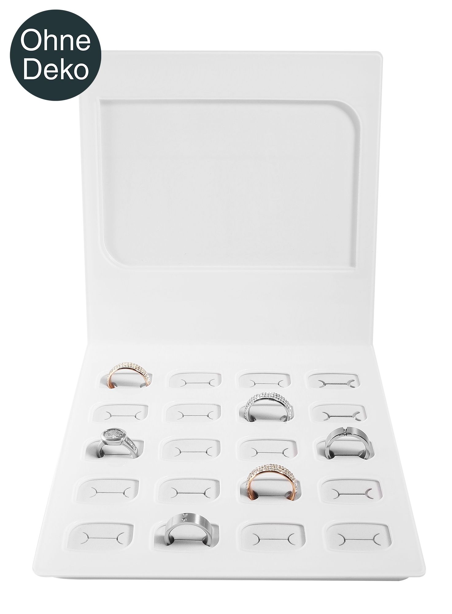 Präsentieren Sie Ihre Ringe auf elegante Weise mit unserem Ringdisplay aus Acryl. Dieser durchdachte Aufsteller bietet Platz für 20 Ringe und zeichnet sich durch Funktionalität und Ästhetik aus. Die Hinterwand ist mit einem transparenten Fenster ausgestattet, das sich durch Schrauben sicher befestigen lässt. Dies eröffnet die Möglichkeit zur Anbringung von Werbeschildern oder anderen Hinweisen, um Ihre Kollektion weiter zu präsentieren. Mit kompakten Abmessungen von 20 x 17 x 4,5 cm ist dieses Display platzsparend und gleichzeitig großzügig in der Präsentationsfläche.