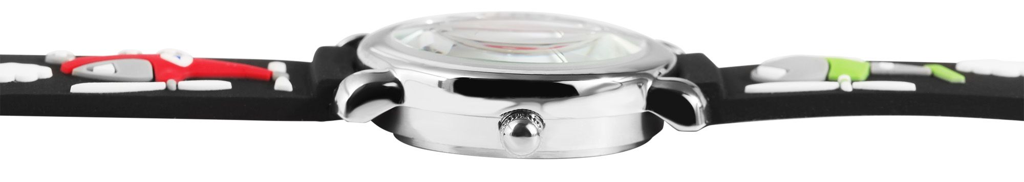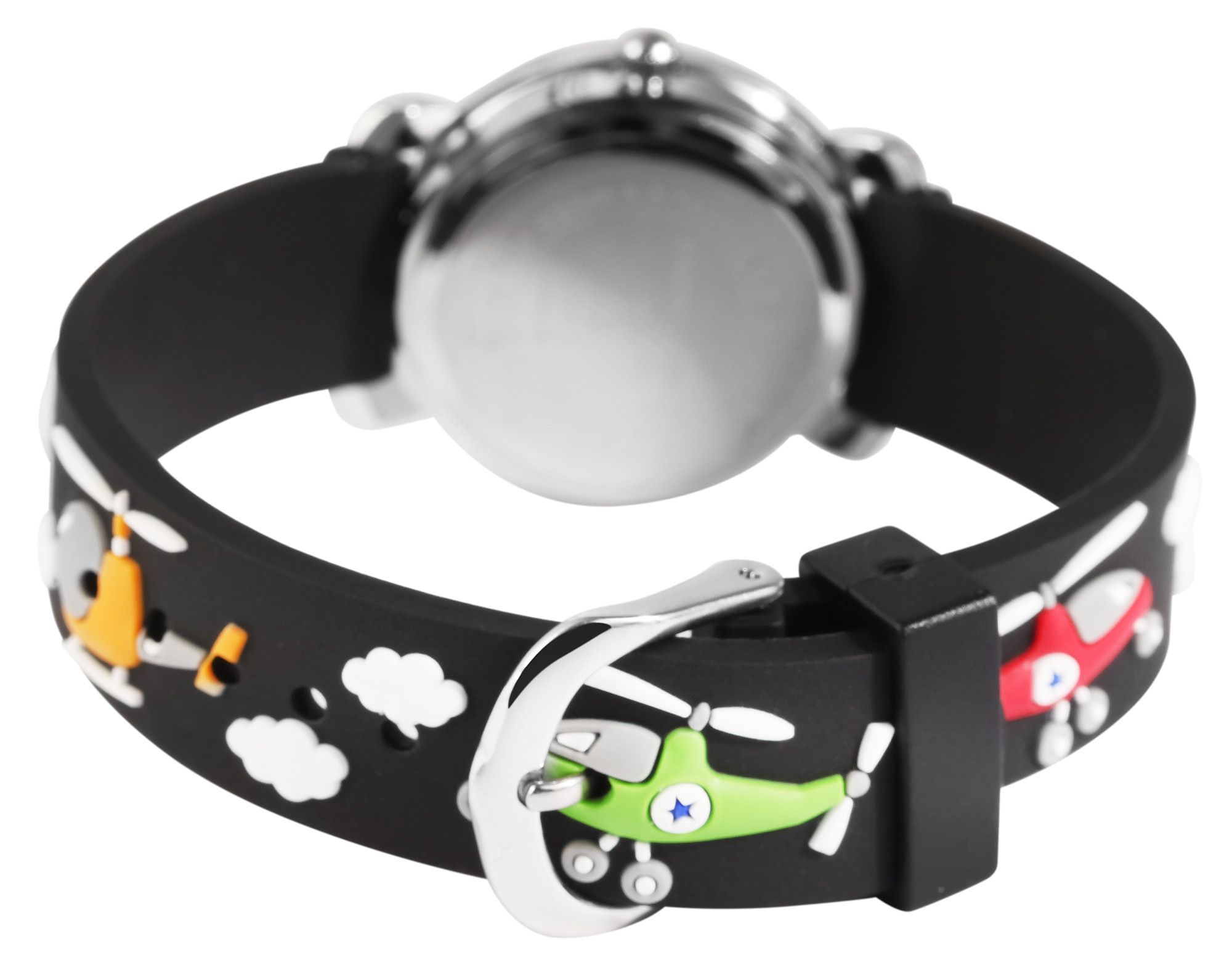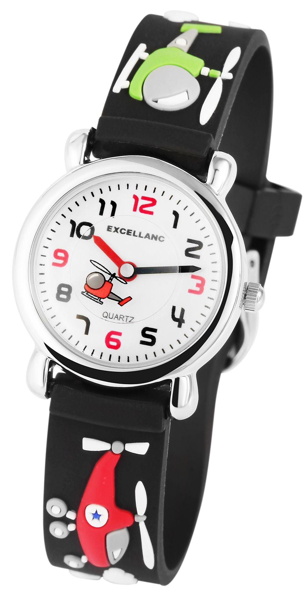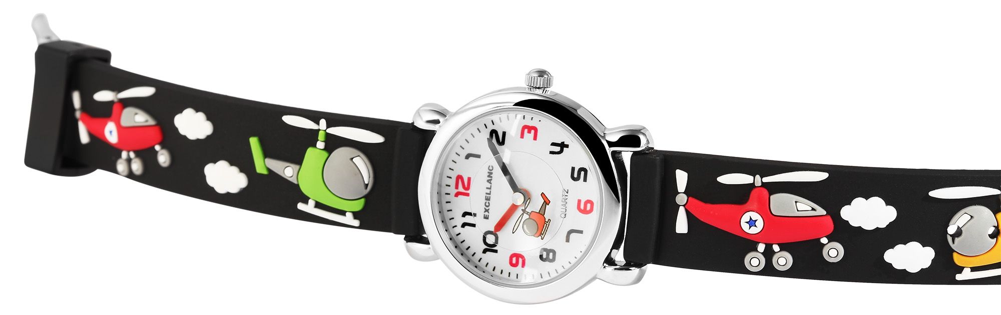 Die analoge 2-Zeiger Kinderarmbanduhr der Marke Excellanc verfügt über das hochwertige Quarzuhrwerk PC21. Das schwarze Silikonarmband ist am Anstoß 14 mm breit und lässt sich mit einer silberfarbenen Dornschließe öffnen und schließen. Die Gesamtlänge der Uhr beträgt 20 cm. Das silberfarbene Metallgehäuse mit Mineralglas hat eine Abmessung von 27 mm im Durchmesser und einer Gehäusehöhe von 10 mm. Der Gehäuseboden ist aus Edelstahl gefertigt. Das farbenfrohe Kautschukarmband ist mit bunten Hubschraubermotiven verziert und sorgt für einen angenehmen Tragekomfort. Das Zifferblatt ist weiß und mit schwarzen und roten Ziffern bedruckt. Der Stundenzeiger ist rot und der Minutenzeiger ist schwarz. Der besondere Sekundenzeiger besteht aus einem feinen durchsichtigen Plättchen, das mit einem kleinen roten Hubschrauber bedruckt ist.