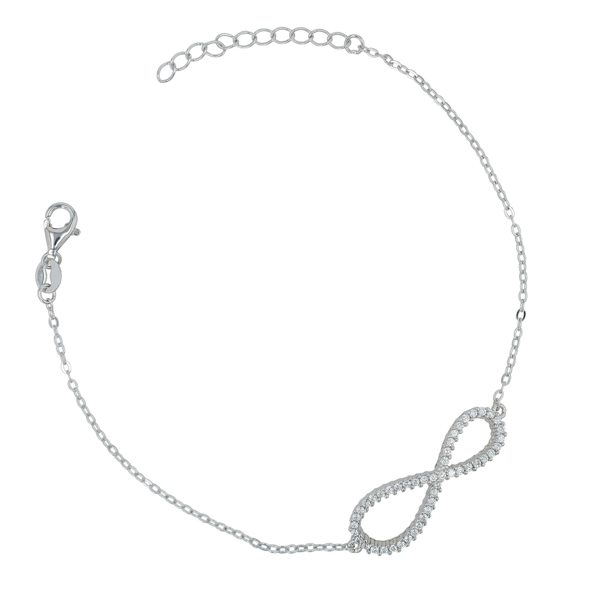 Gemaakt van 925/- sterling zilver en verfijnd met een gerhodineerde afwerking, biedt deze armband niet alleen een uitzonderlijke glans, maar ook een verhoogde weerstand tegen aantasting. De rhodiumplating zorgt voor langdurige schoonheid en maakt het een duurzame metgezel in elke sieradencollectie. De armband wordt gekenmerkt door een fijne kettingstijl met een asymmetrisch oneindigheidssymbool in het midden. Dit symbool is bezet met elegante zirkonia steentjes die bij elke beweging het licht vangen en voor een indrukwekkende schittering zorgen.