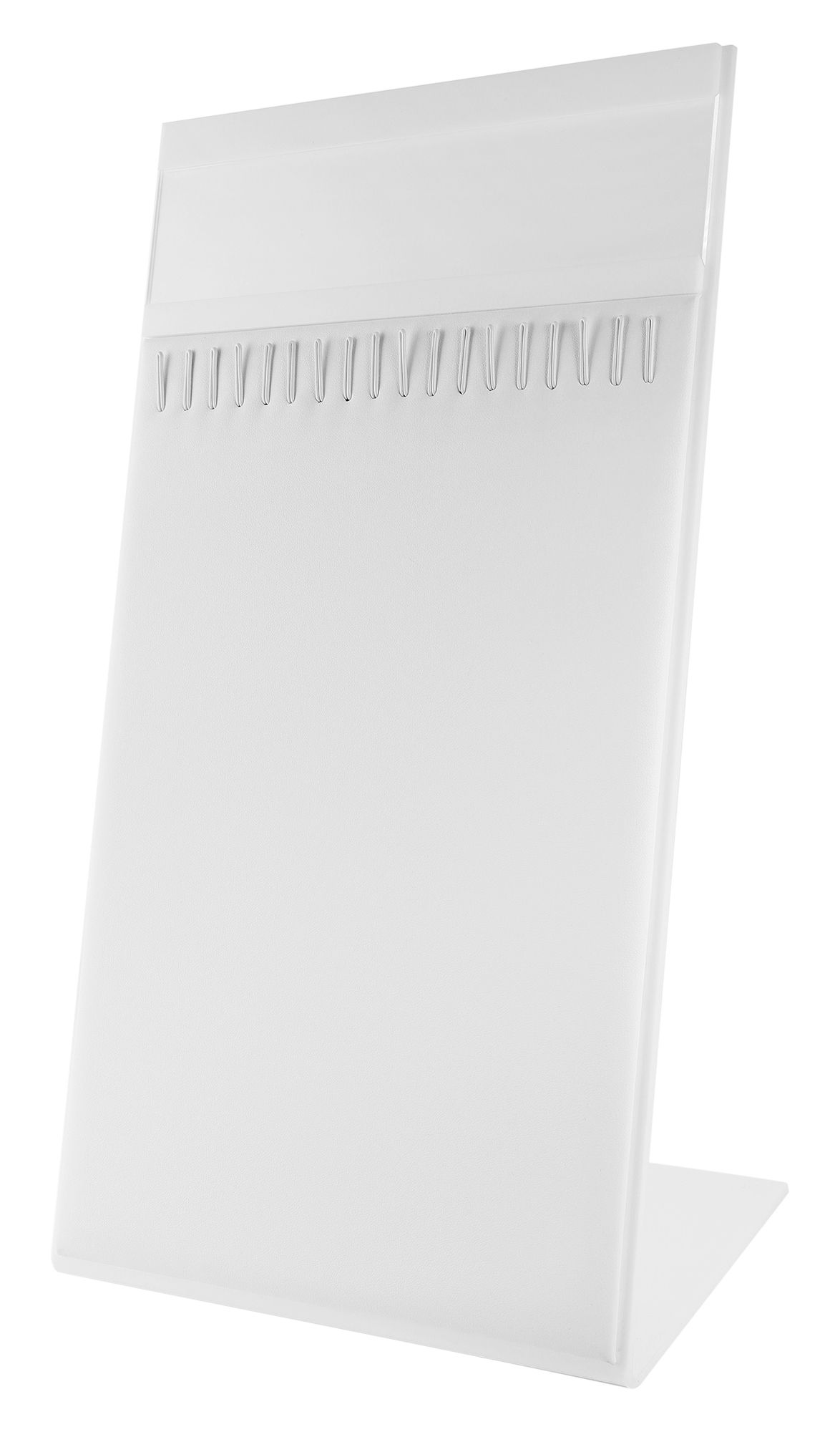 Präsentieren Sie Ihren Schmuck perfekt und ansprechend mit unseren hochwertgen Schmuckdisplay aus weißem Kunststoff. Die klare, stilvolle Optik dieser Displays lenkt den Fokus auf Ihren Schmuck und setzt diese auf der Ladentheke oder im Schaufenster gekonnt in Szene. Jedes Displays hat im oberen Bereich die Möglichkeit für eine einseitige Einlagenbeschriftung z.B. ein individueller Schriftzug oder ein passendes Bild zum präsentierten Schmuck.