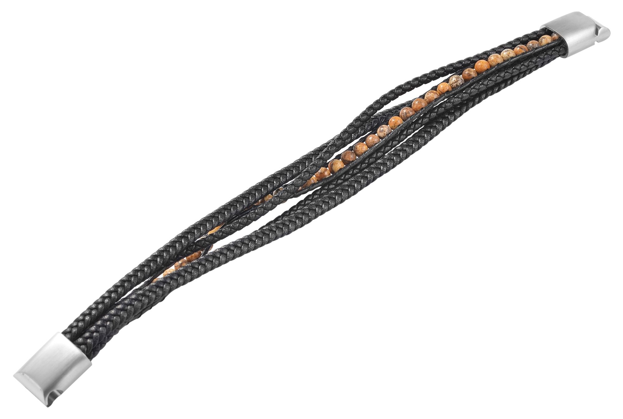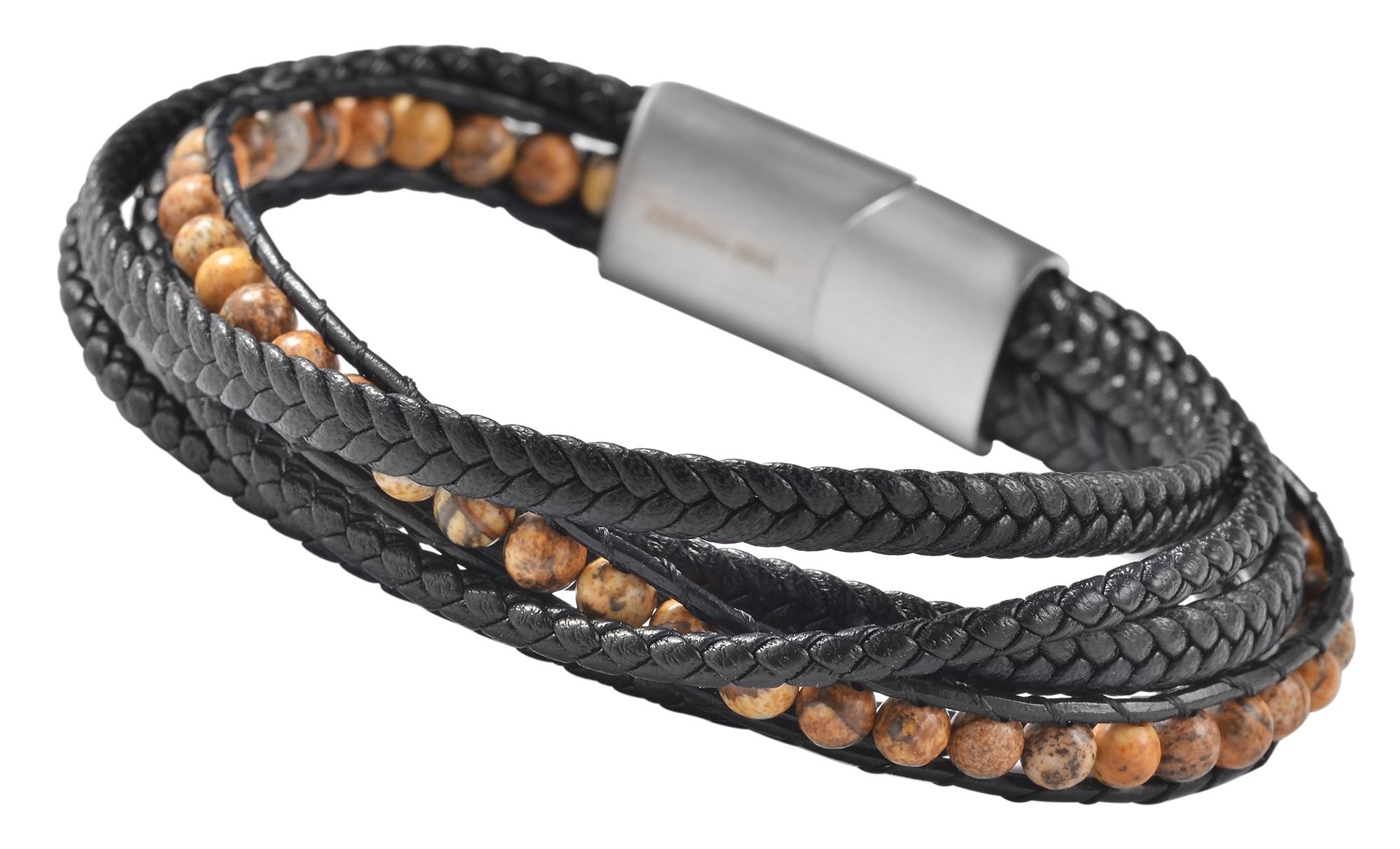 Deze zwarte armband van het merk Akzent is gemaakt van imitatieleer en kralen van natuursteen en is verkrijgbaar in lengtes van 19 cm, 21 cm en 23 cm. De vijfrijige armband bestaat uit twee gevlochten banden en koorden van imitatieleer en een streng kralen van de edelsteen jaspis. Door de natuurlijke aard van het mineraal kwarts is elke kraal uniek en heeft daardoor verschillende kleureffecten. De armband kan gemakkelijk worden geopend en gesloten met een praktische en stevige magnetische sluiting en kan ook worden gepersonaliseerd met kleine gravures. Deze armband is het perfecte accessoire om je outfit compleet te maken en is bijzonder huidvriendelijk dankzij de natuurlijke en hoogwaardige grondstoffen.