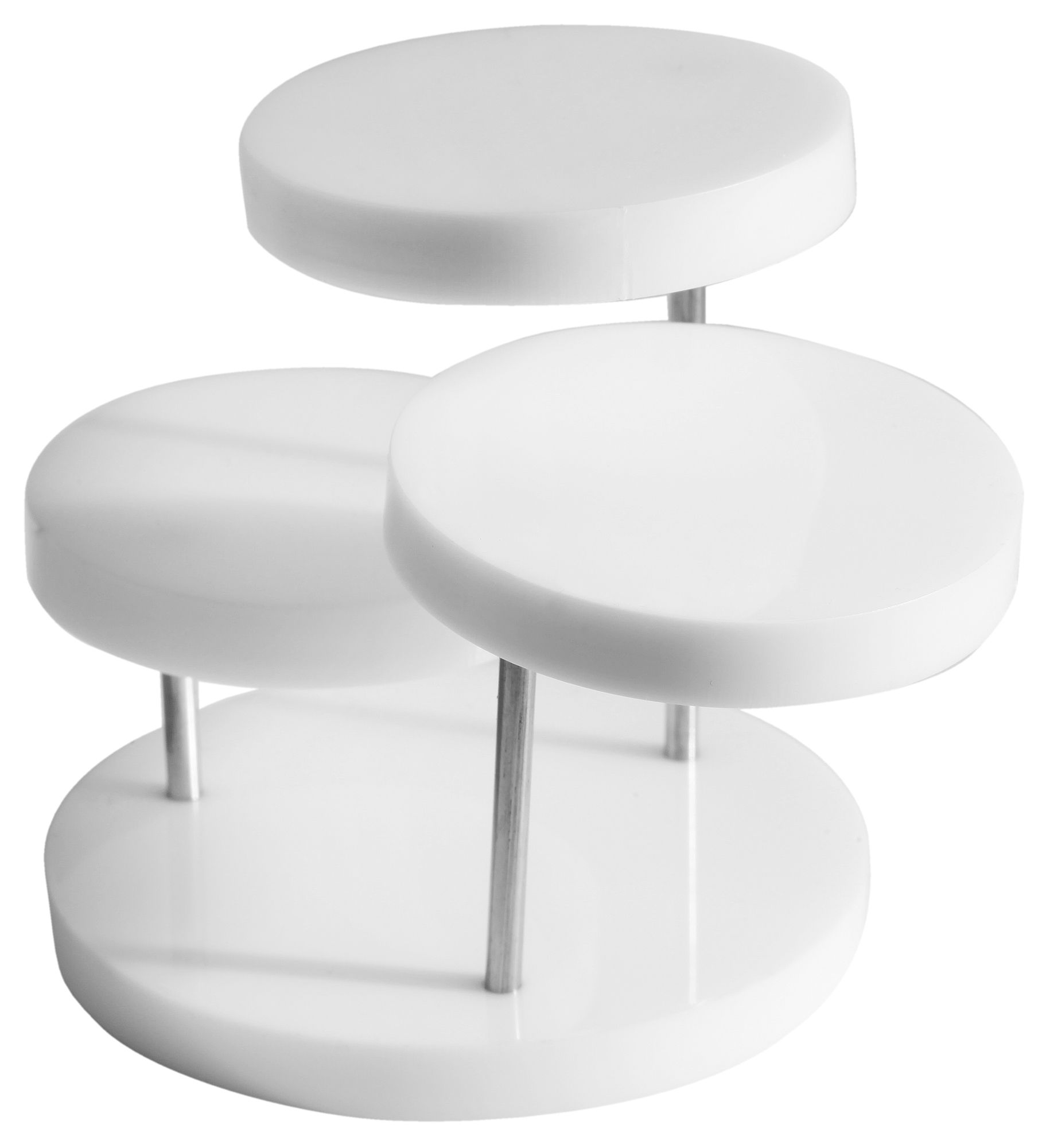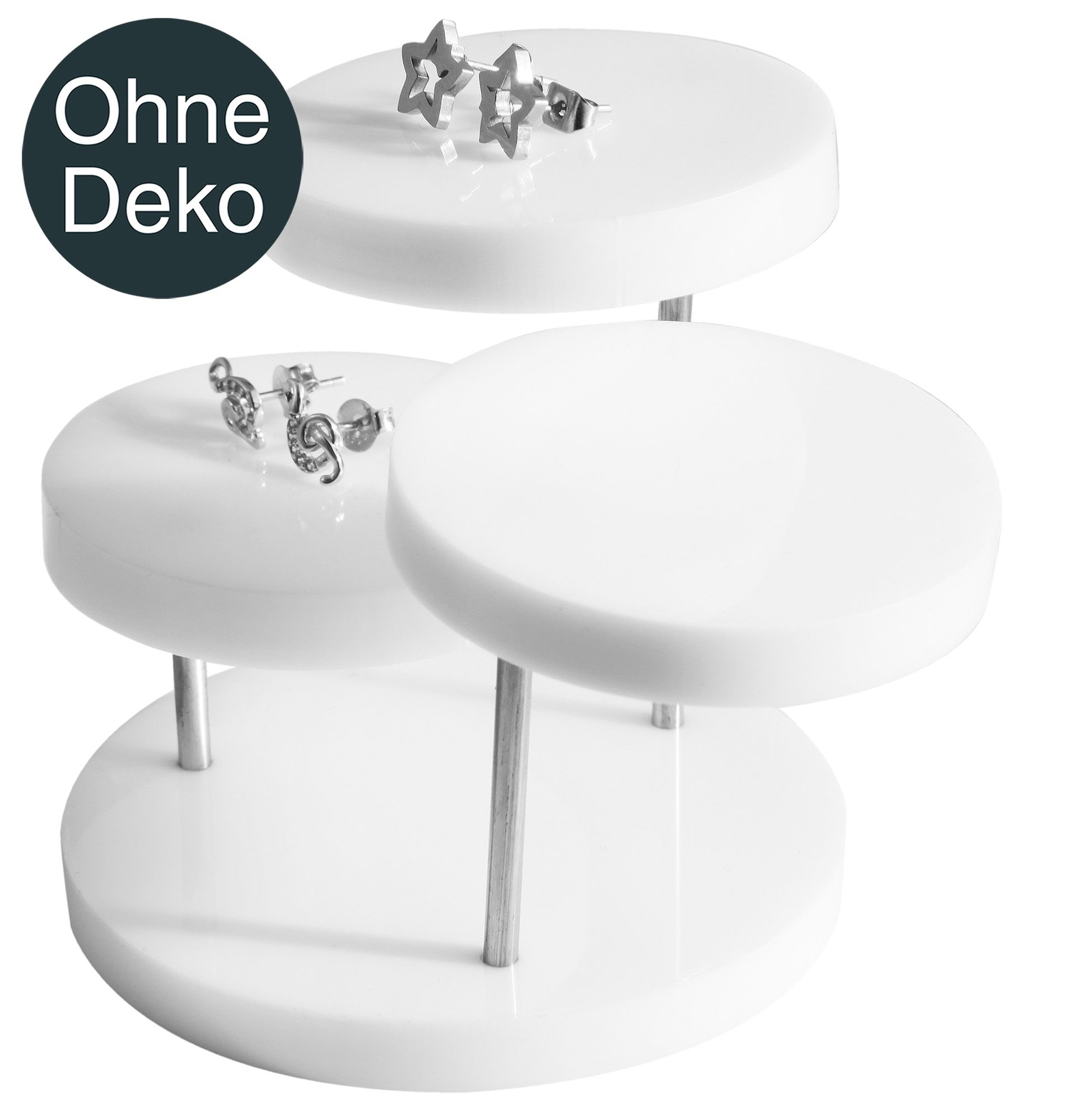 Der dreistufige weiße Schmuckaufsteller ist für vielerlei Schmuck verwendbar. Aufgrund der kleinen Ebenen, die alle einen Durchmesser von 5 cm haben, ist der Aufsteller sehr gut zum Präsentieren von Ringen, Ohrsteckern und Anhängern geeignet. Der Aufsteller ist 7 cm hoch und unausgeklappt 7 cm breit. Da die drei Ebenen ausgefahren werden können, kann sich dieser sogar auf eine breite von 12 cm erstrecken. Der Aufsteller ist in der Farbe weiß erhältlich.