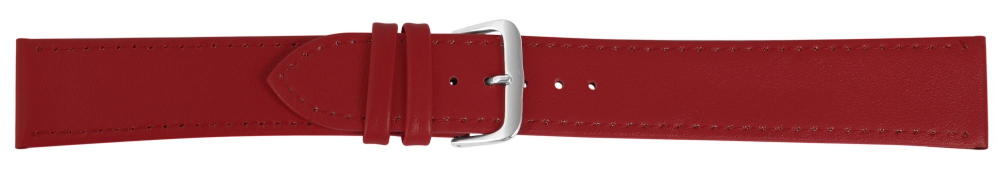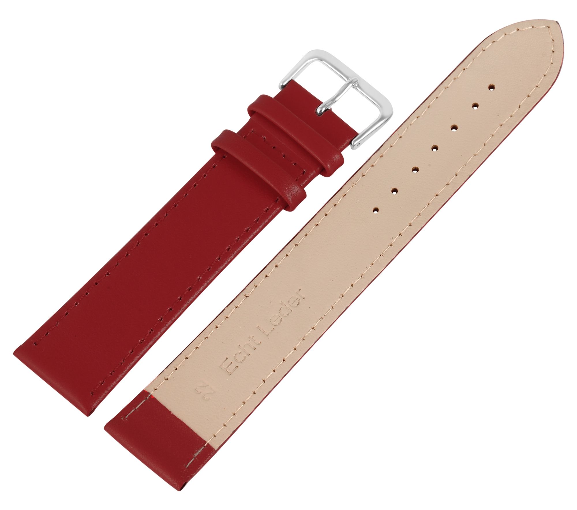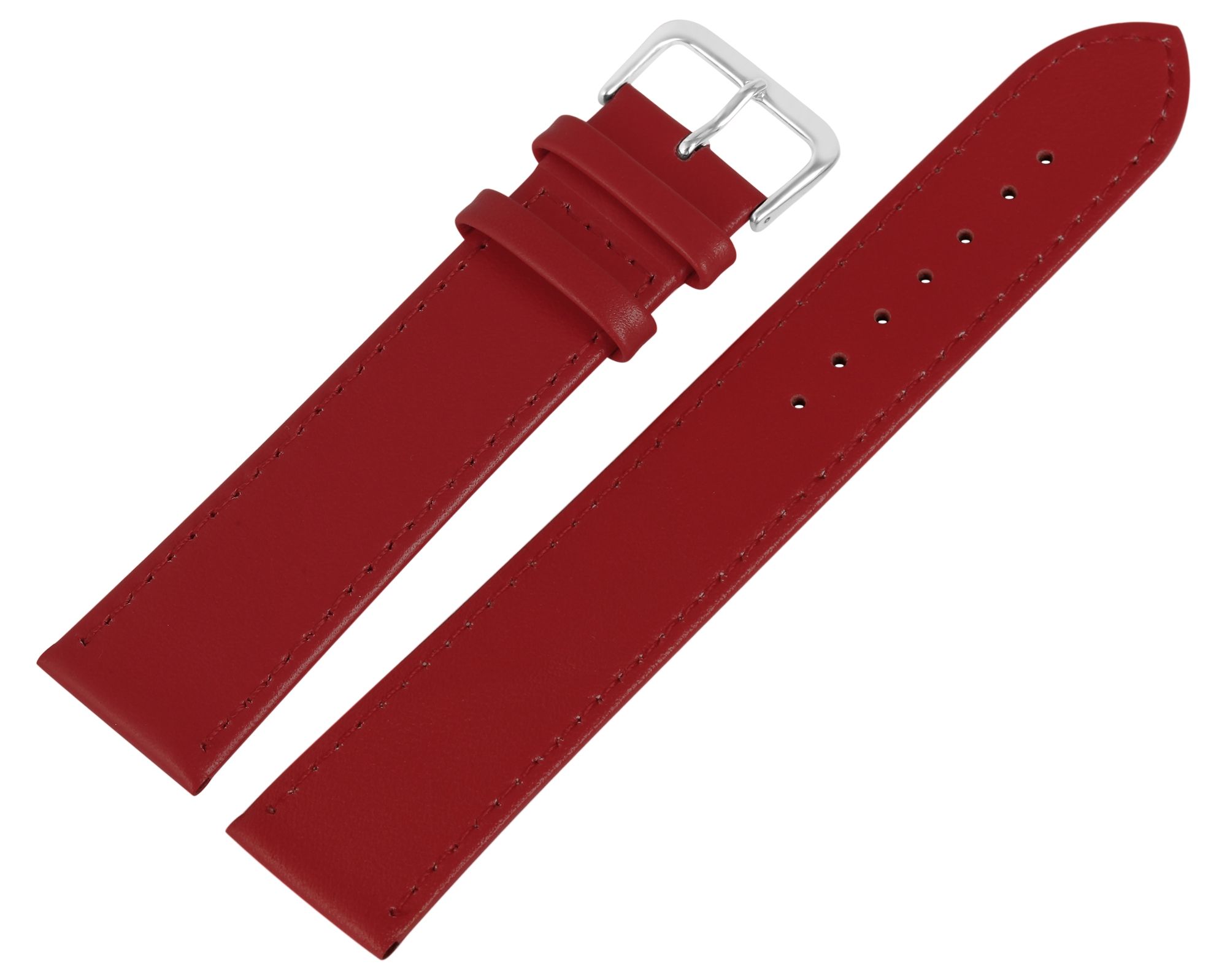 De rode horlogeband van echt leer is verkrijgbaar met een lugbreedte van 10 mm - 24 mm en in een verpakkingseenheid van zes stuks. Het heeft een glad oppervlak en is afgezet met een fijne rode naad. De materiaaldikte is 2 mm. De XXL vervangingsarmband heeft een totale lengte tussen 21 cm en 24 cm, afhankelijk van de lugbreedte. De sluiting is 2 mm smaller dan de breedte van de lug, omdat het bandje smal is. De vervangingsarmband kan worden geopend en gesloten met een zilverkleurige, hoogglans gepolijste gesp. De glanzende afwerking in combinatie met het gladde leren bandje benadrukt het mooie design van het horlogebandje en zorgt ervoor dat het snel en gemakkelijk om- en afgedaan kan worden.