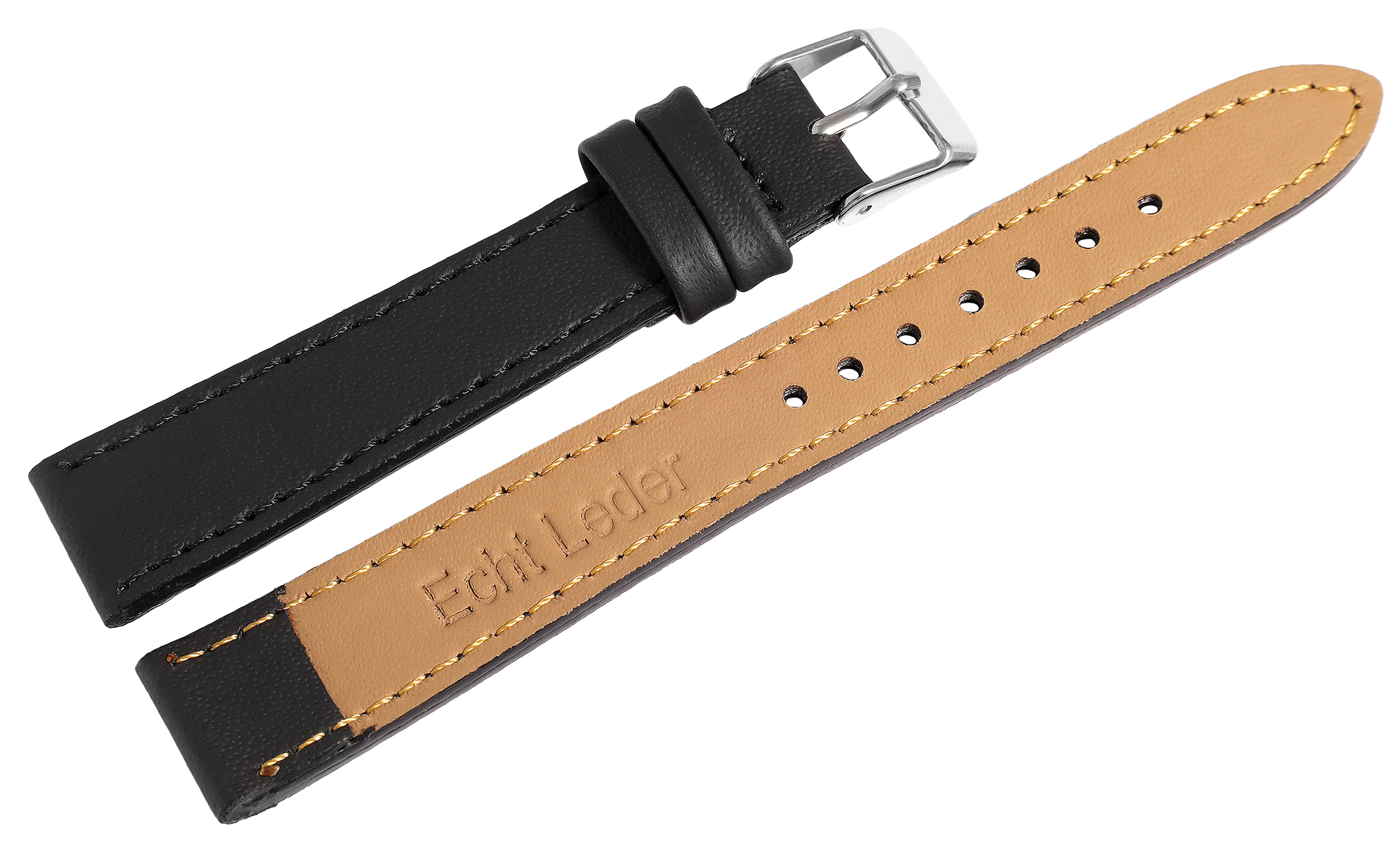Dieses zeitlose Echtleder-Uhrenarmband in Schwarz ist das ideale Basic-Ersatzmaterial für jede Uhrenwerkstatt und den täglichen Bedarf.
