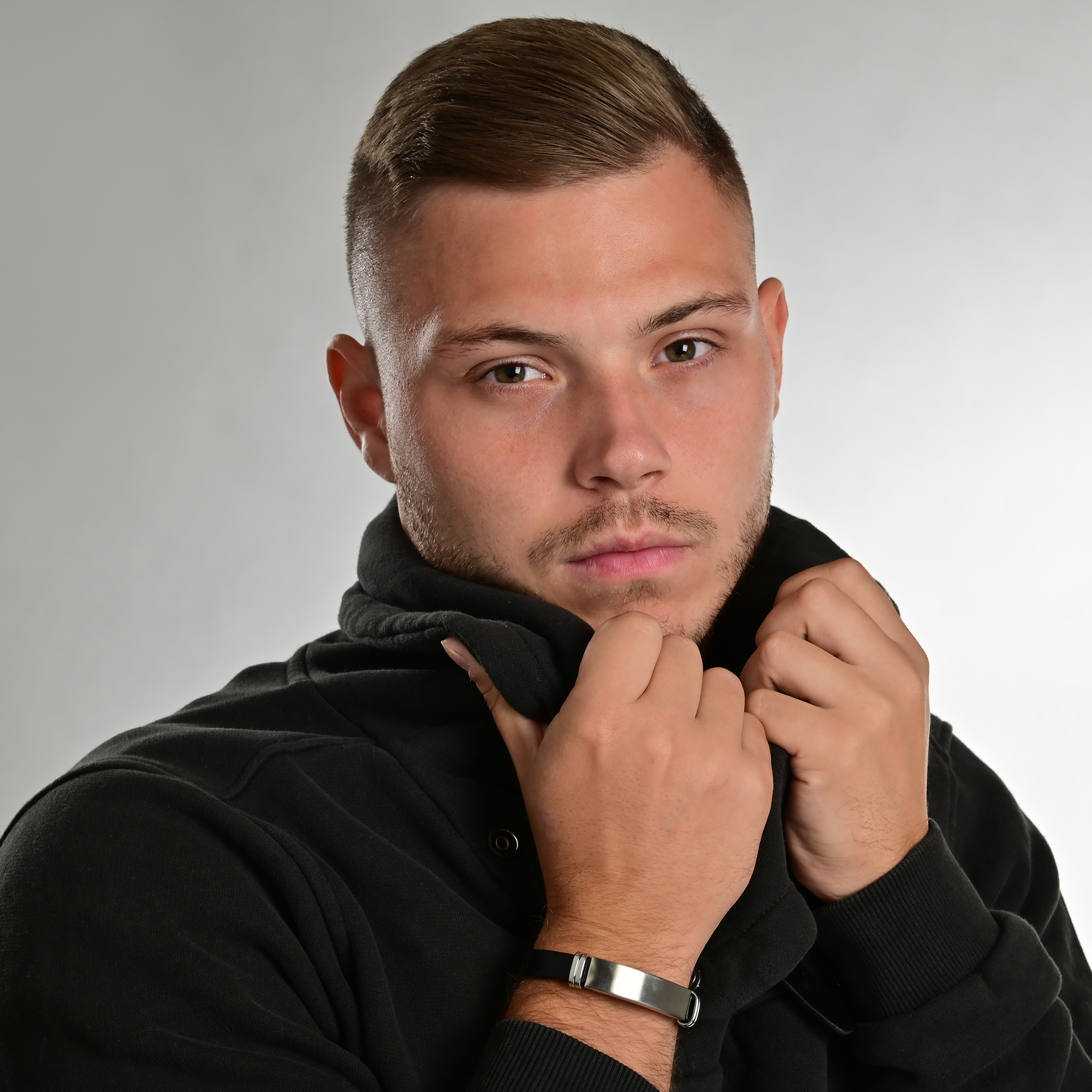 Die Edelstahlplatte, die das Armband verziert, eignet sich hervorragend für Gravuren. Ein personalisiertes Schmuckstück für Sie selbst oder als Geschenk.
