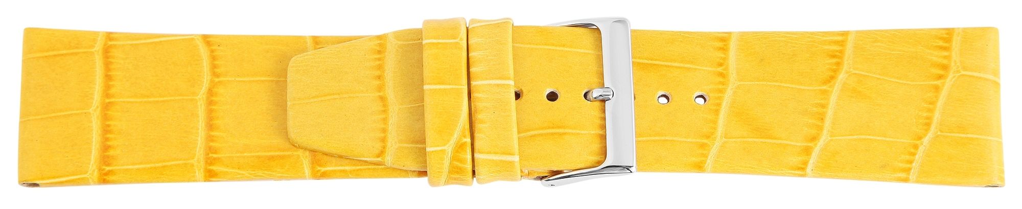 Klassisches Echtleder Ersatzarmband in der Farbe Gelb. Es ist aus feinstem Rindsleder hergestellt und im Alligatorlederdesign geprägt. Das Armband besitzt eine Stegbreite von 22 mm, eine silberfarbige Dornschließe sowie zwei Armbandschlaufen. Der Lochteil läuft am Ende spitz zu.