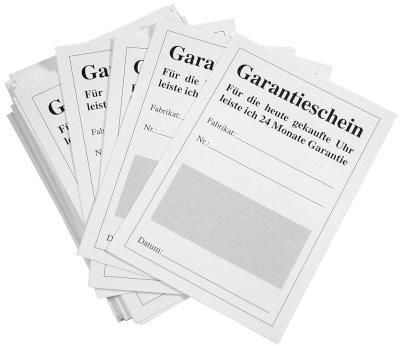 24 monatige Garrantiekarten in einer Verkaufseinheit von 100 Stück. Diese können Sie bei dem Verkauf eines Produktes Ihrem Kunden mitgeben. DIe Maße betragen: Länge 10,5 cm und Breite 7,5 cm.