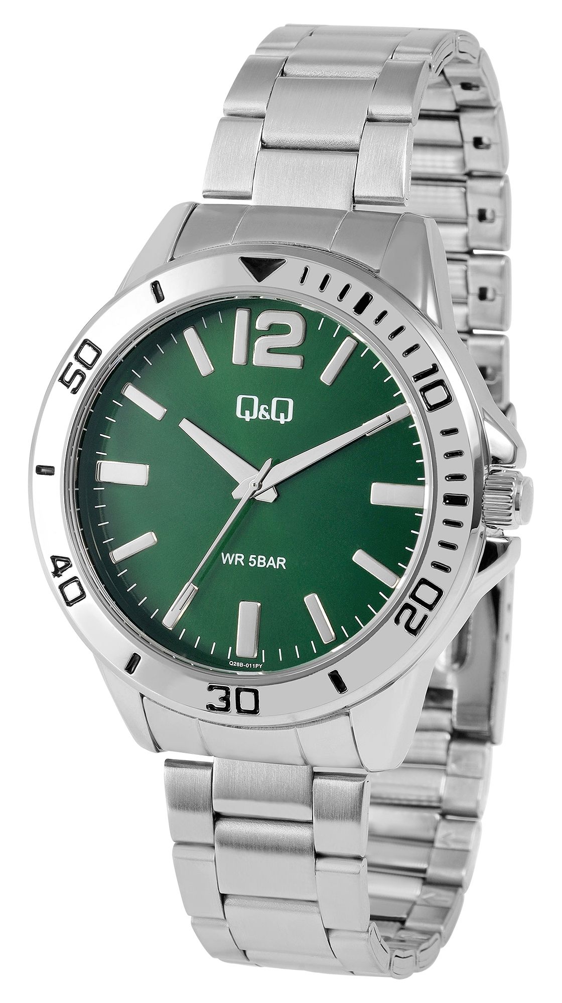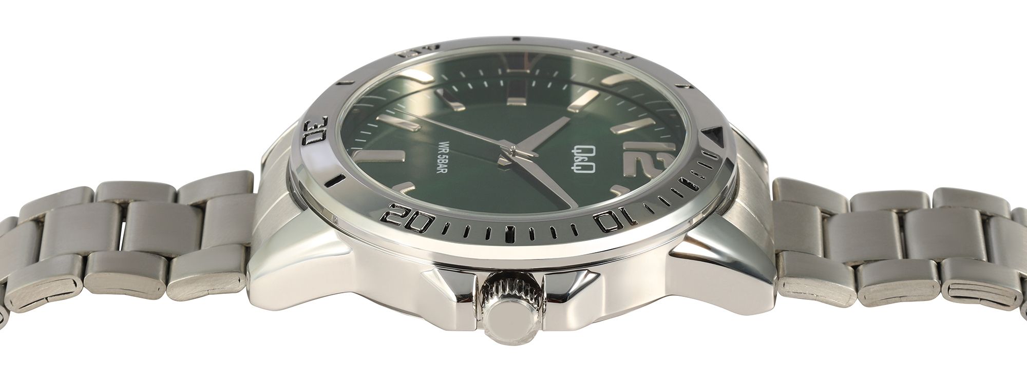 Productinformatie "Q&Q Herrenuhr, Edelstahlarmband, silberfarben/grün, 5 ATM, Ø 44 mm"