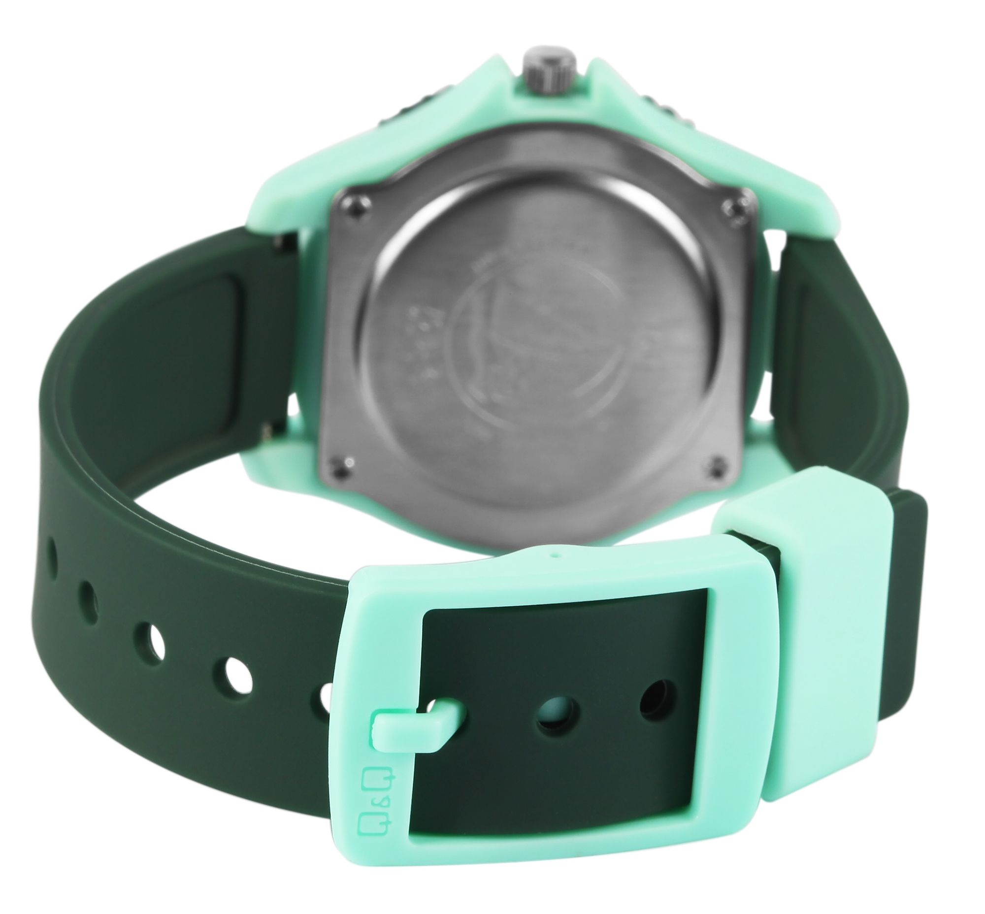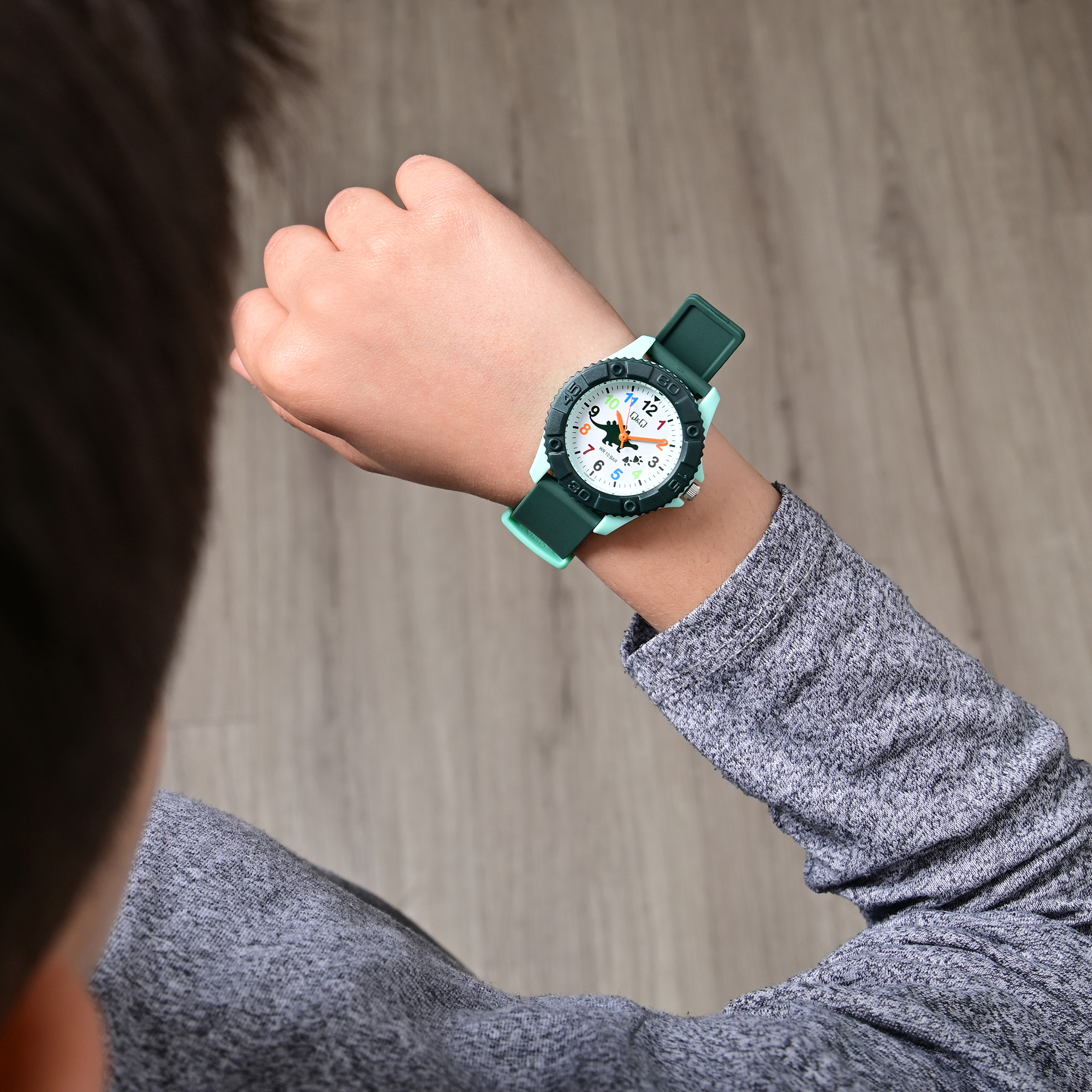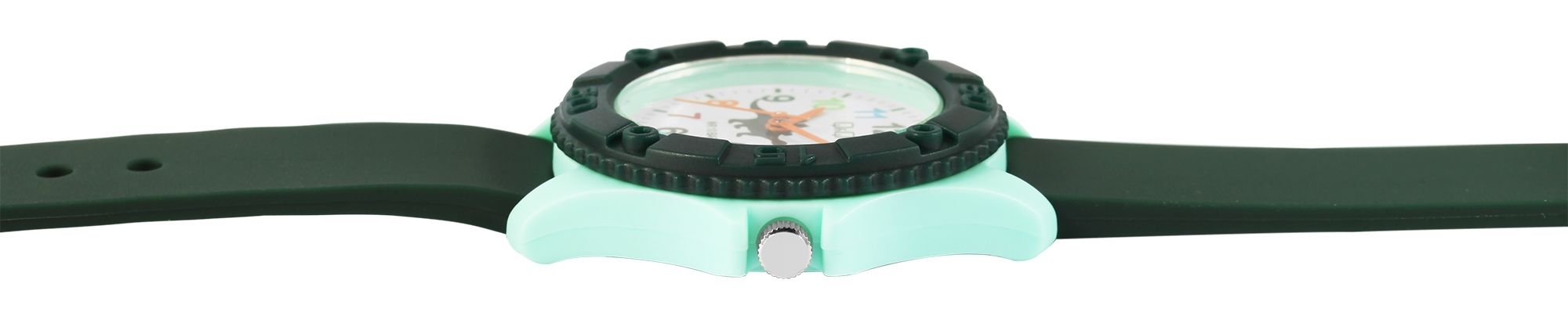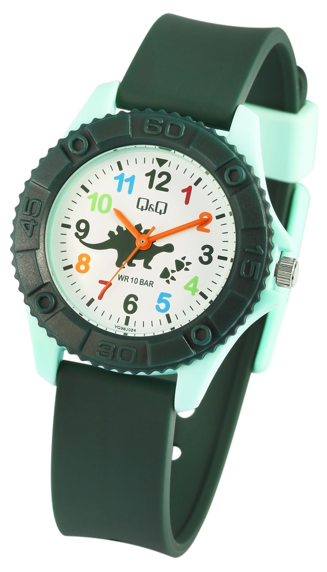 Die analoge 3-Zeiger Kinderarmbanduhr der Marke Q&Q - by Citizen Watch Co. LTD verfügt über ein hochwertiges Quarzuhrwerk. Das dunkelgrüne Silikonarmband ist am Anstoß 16 mm breit und lässt sich mit einer hellgrünen Dornschließe aus Kunststoff öffnen und schließen. Dank des Materials ist die Uhr nicht nur robust, sie sorgt auch für einen angenehmen Tragekomfort. Die Gesamtlänge der Uhr beträgt 24 cm. Das hellgrüne Kunststoffgehäuse mit Kunststoffglas hat eine Abmessung von 35 mm im Durchmesser und einer Gehäusehöhe von 10 mm. Der Gehäuseboden ist aus Edelstahl gefertigt. Das Zifferblatt ist weiß und mit bunten Ziffern bedruckt, die drei Zeiger sind orange. Des Weiteren ist das Zifferblatt mit einem Dinosaurier schmückt und die Uhr hat eine Wasserdichtigkeit von 10 bar.