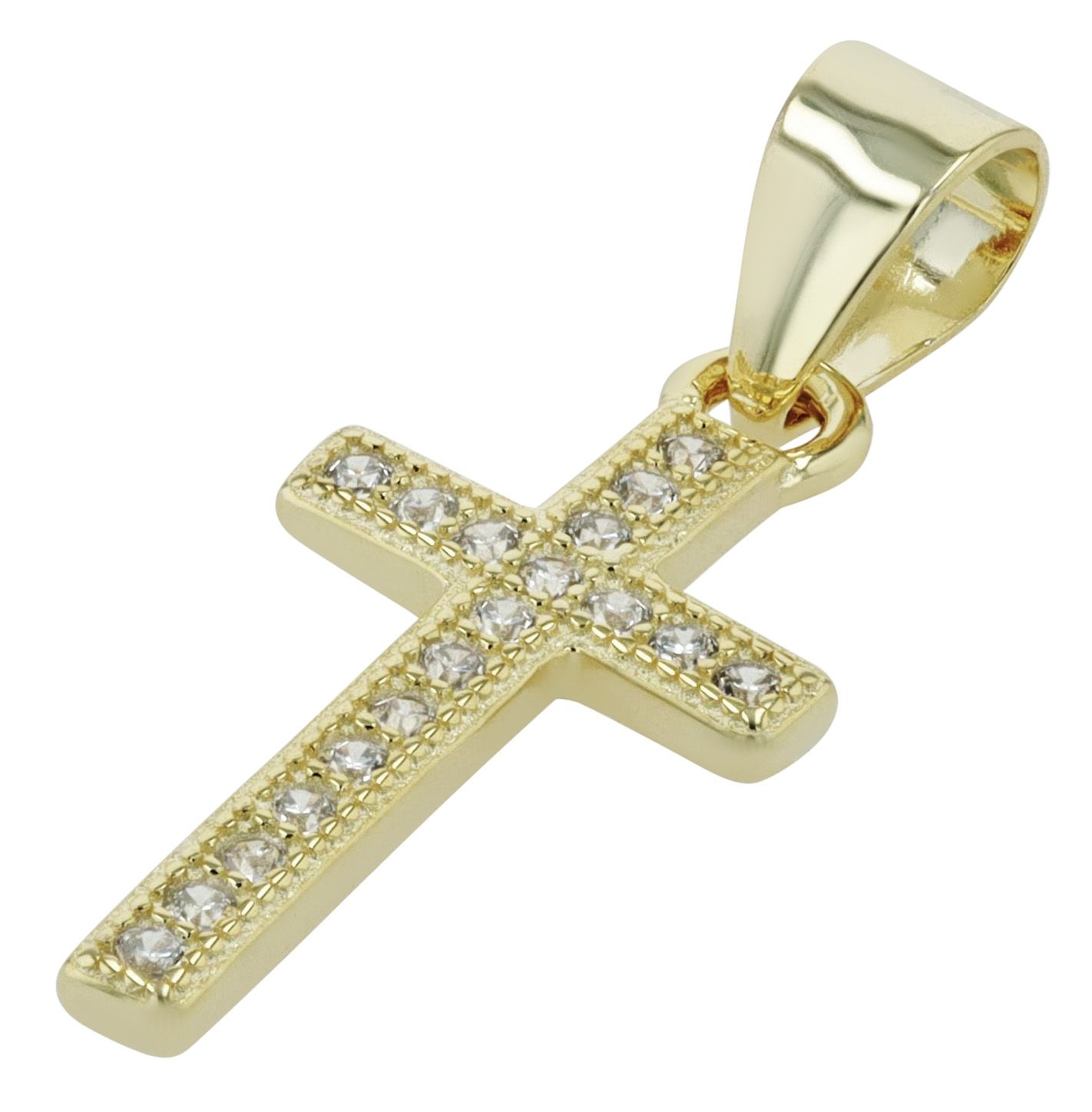 Der exquisite Kettenanhänger ist aus 925er Sterling Silber gefertigt und in zwei Varianten erhältlich: vergoldet für einen warmen Goldton oder rhodiniert für einen strahlenden Glanz. Der Goldton verleiht dem Anhänger eine zeitlose Eleganz, während die Rhodinierung zusätzlichen Schutz vor dem Anlaufen bietet und seinen Glanz bewahrt. Mit 19 funkelnden Zirkonia besetzt, strahlt dieser eine unvergleichliche Brillanz aus. Die Zirkonia fangen das Licht ein und sorgen für ein atemberaubendes Funkeln. Mit den Maßen von 15 x 9 x 1,5 mm hat das Kreuz die perfekte Größe. Geliefert wird dieses ohne Kette, kann aber dank der Öse kann der Anhänger an sämtlichen Kettenarten mühelos befestigt werden. Dieser ist ein vielseitiges Accessoire, welches zu jedem Outfit kombiniert werden wann und somit ein stilsicherer Begleiter zu jedem Anlass ist.
