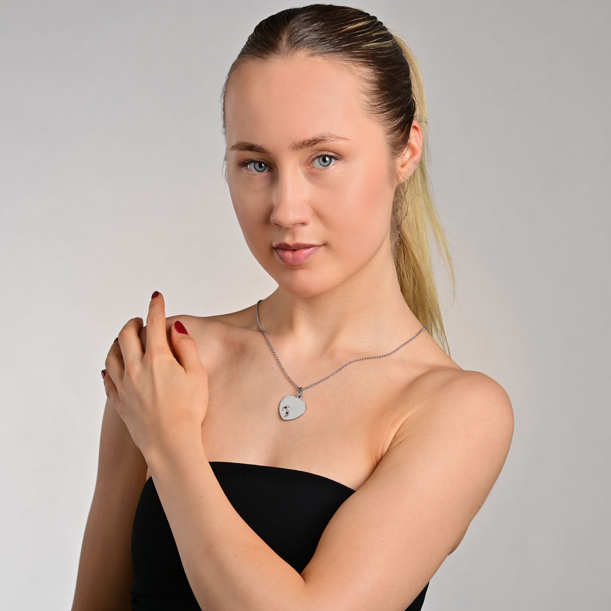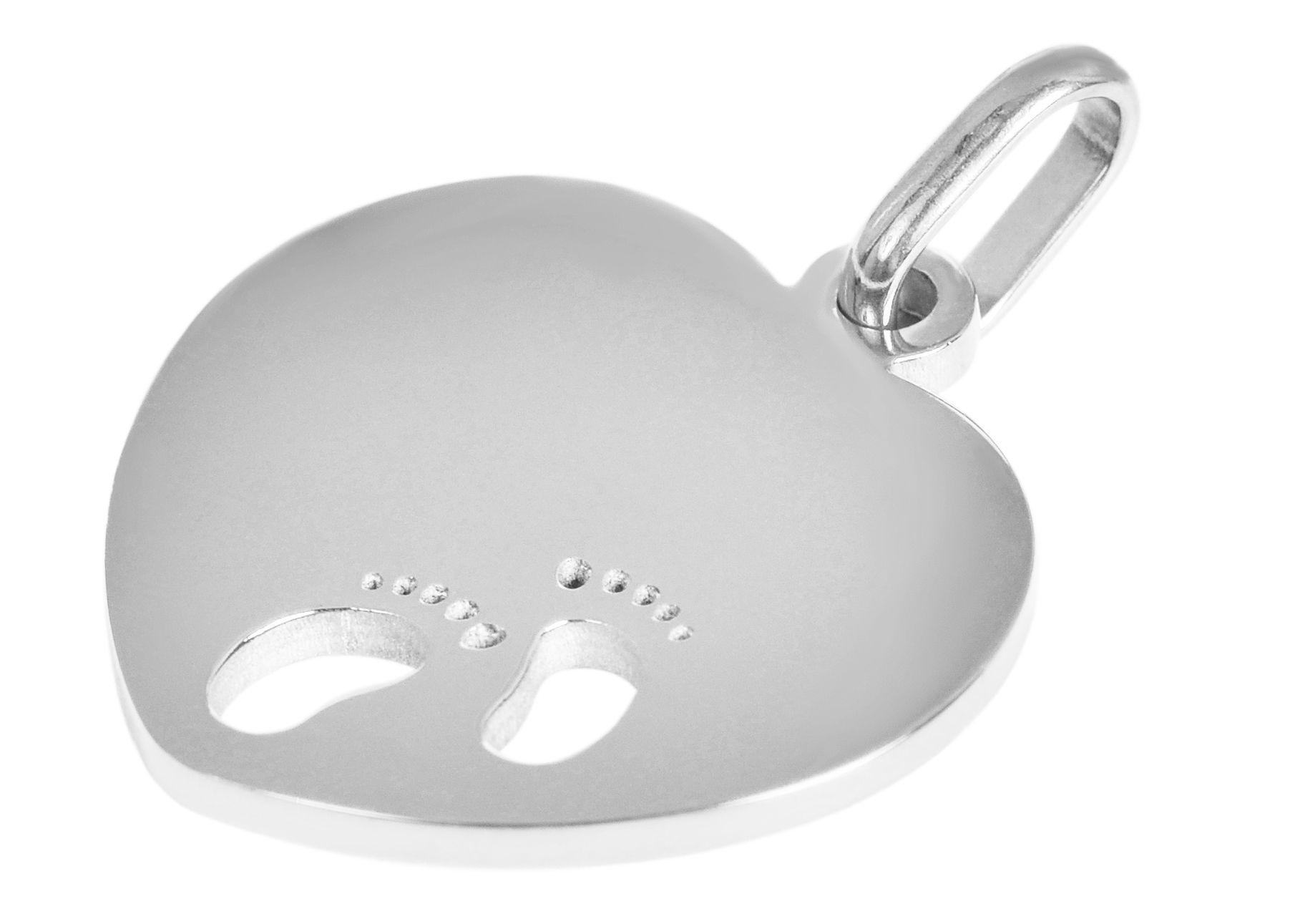 Der silberfarbene Gravuranhänger der Marke Akzent ist aus Edelstahl gefertigt und hat die Form eines Herzens. In das Herz wurden seitlich zwei kleine Fräsungen gemacht, die die Form von zwei kleinen Babyfüßen haben. Diese machen den Kettenanhänger zu einem besonderen Hingucker. Die restliche Fläche des Anhängers kann sowohl auf der Vorder- als auch auf der Rückseite mit Gravuren aller Art versehen werden. Die Oberfläche der Gravurplatte ist hochglanzpoliert. Die Maße des massiven Anhängers ergeben sich aus einer Länge von 26,5 mm, einer Breite von 25 mm und einer Materialstärke von 2 mm. Durch das robuste Material und die hochwertige Verarbeitung verspricht der Schmuckanhänger eine lange Lebensdauer.