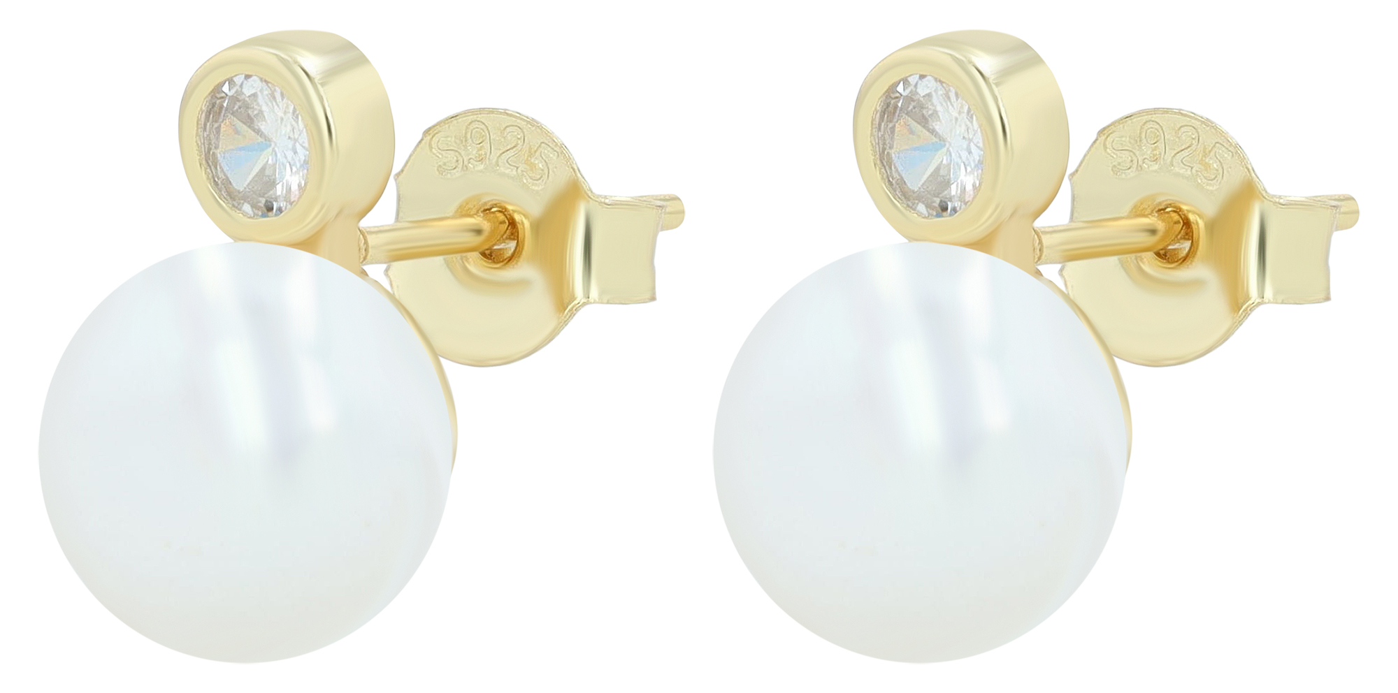 Die glanzvollen Ohrstecker aus 925er Sterling Silber mit einer Gesamthöhe von 12 mm sind besetzt mit einer echten Süßwasserperle, Durchmesser 8 mm, und einem funkelnden Zirkonia-Stein in Krappenfassung. Verfügbar in 2 Farbvarianten - klassisch silberfarben oder warm vergoldet - ist dieses Accessoires ein Must-have für Liebhaber von zeitloser Eleganz und moderner Raffinesse. Der Steckverschluss bietet einen hohen und sicheren Tragekomfort, durch die Rhodinierung bleibt der Glanz der Schmuckstücke erhalten. Perfekt als besonderes Geschenk für jeden Anlass.