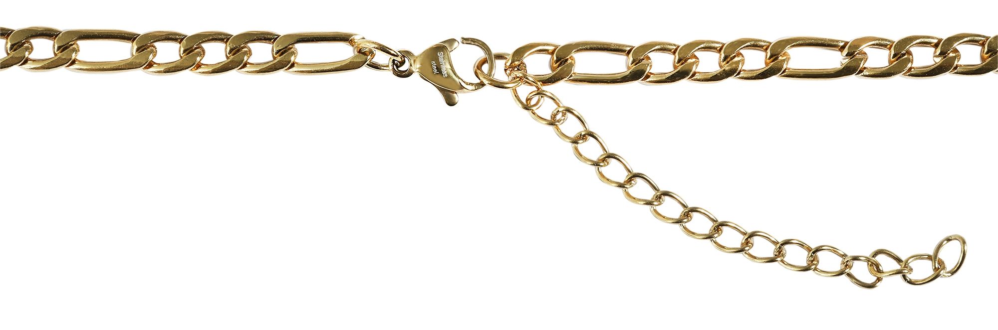 Die goldfarbene Halskette der Marke Raptor ist aus Edelstahl im Figaromuster gefertigt. Ähnlich wie bei der Panzerkette sorgen die flachen Elemente für einen angenehmen Tragekomfort. Die Kette ist in verschiedenen Längen erhältlich, hat eine Breite von 4 mm und eine Stärke von 1,5 mm. Öffnen und schließen lässt sich die schlichte Schmuckkette mit einem Karabinerhaken, der ebenfalls aus Edelstahl gefertigt ist. Zusätzlich ist an das eine Ende der Kette ist zusätzlich eine 5 cm lange Verlängerungskette angebracht, die es ermöglicht, die Länge der Kette um bis zu 5 cm zu variieren und sie so an jedes Outfit anpassen zu können. Durch das robuste Material und die hochwertige Verarbeitung verspricht die Halskette eine lange Lebensdauer.