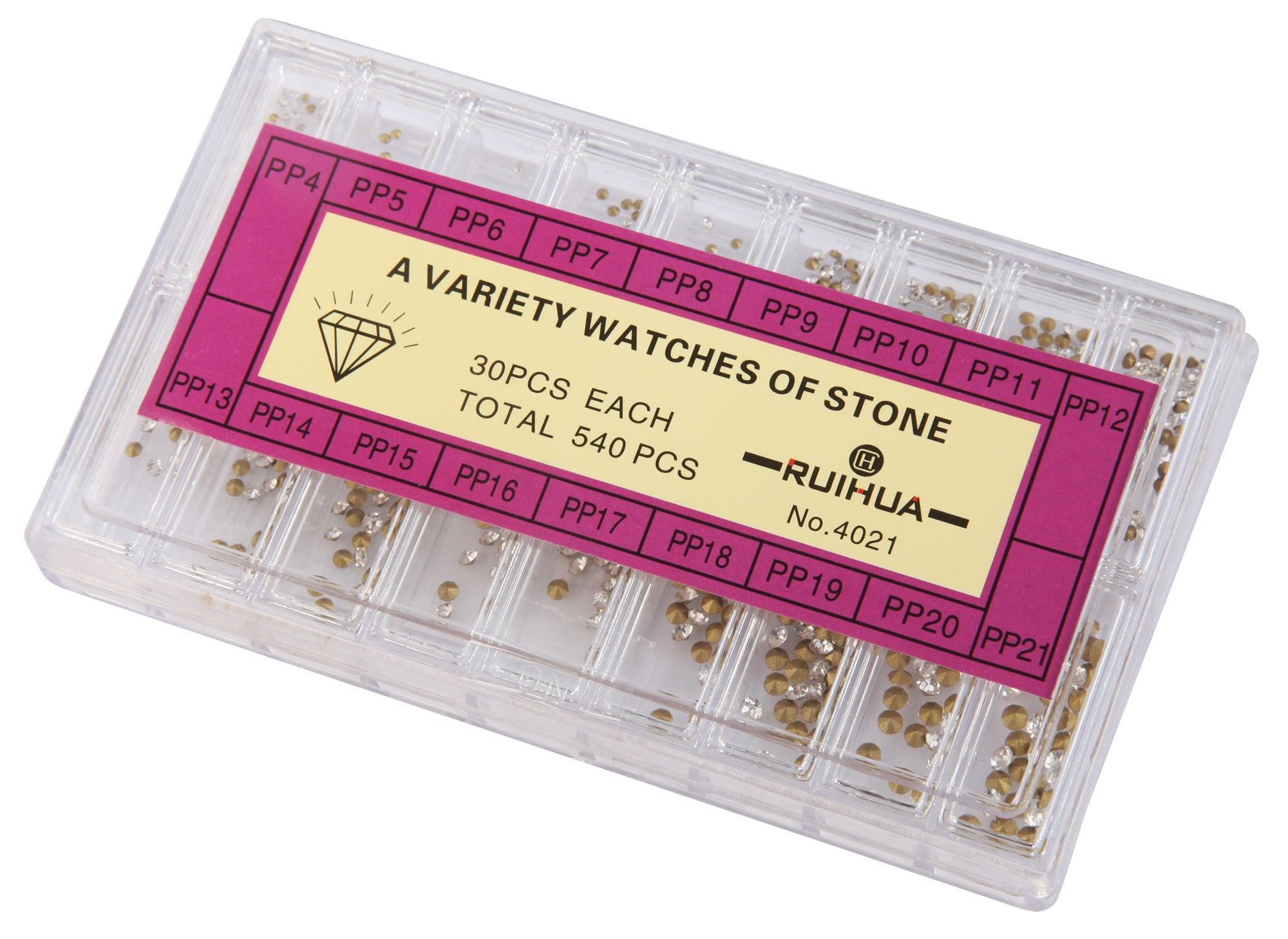 Das Similistein-Set besteht aus 540 Similisteinen in 18 verschieden Größen. Der kleinste Stein ist 1,1 mm groß und der größte Stein 2,8 mm. Die Zwischengrößen sind dann dementsprechend 1,2 mm, 1,3 mm, 1,4 mm, 1,5 mm, 1,6 mm, 1,7 mm, 1,8 mm, 1,9 mm, 2,0 mm, 2,1 mm, 2,2 mm, 2,3 mm, 2,4 mm, 2,5 mm, 2,6 mm und 2,7 mm. Von jeder Größe gibt es jeweils 30 Steine. Alle Similisteine sind weiß und lassen sich gut in Schmuck und Uhren einkleben. Dank der Folierung, die jeder Stein auf der Rückseite hat, verlieren Sie ihren Glanz nicht.