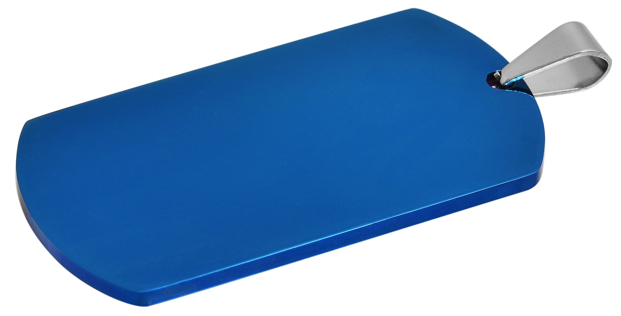 Der Gravuranhänger, für Gravuren aller Art, der Marke Akzent besteht aus dem Material Edelstahl und ist zusätzlich IP beschichtet. Die Farbe des Anhängers ist blau, die Öse silberfarbig. Die Oberfläche ist hochglanzpoliert. Die Maße betragen: Länge 50 mm, Breite 27 mm und Stärke 2 mm.