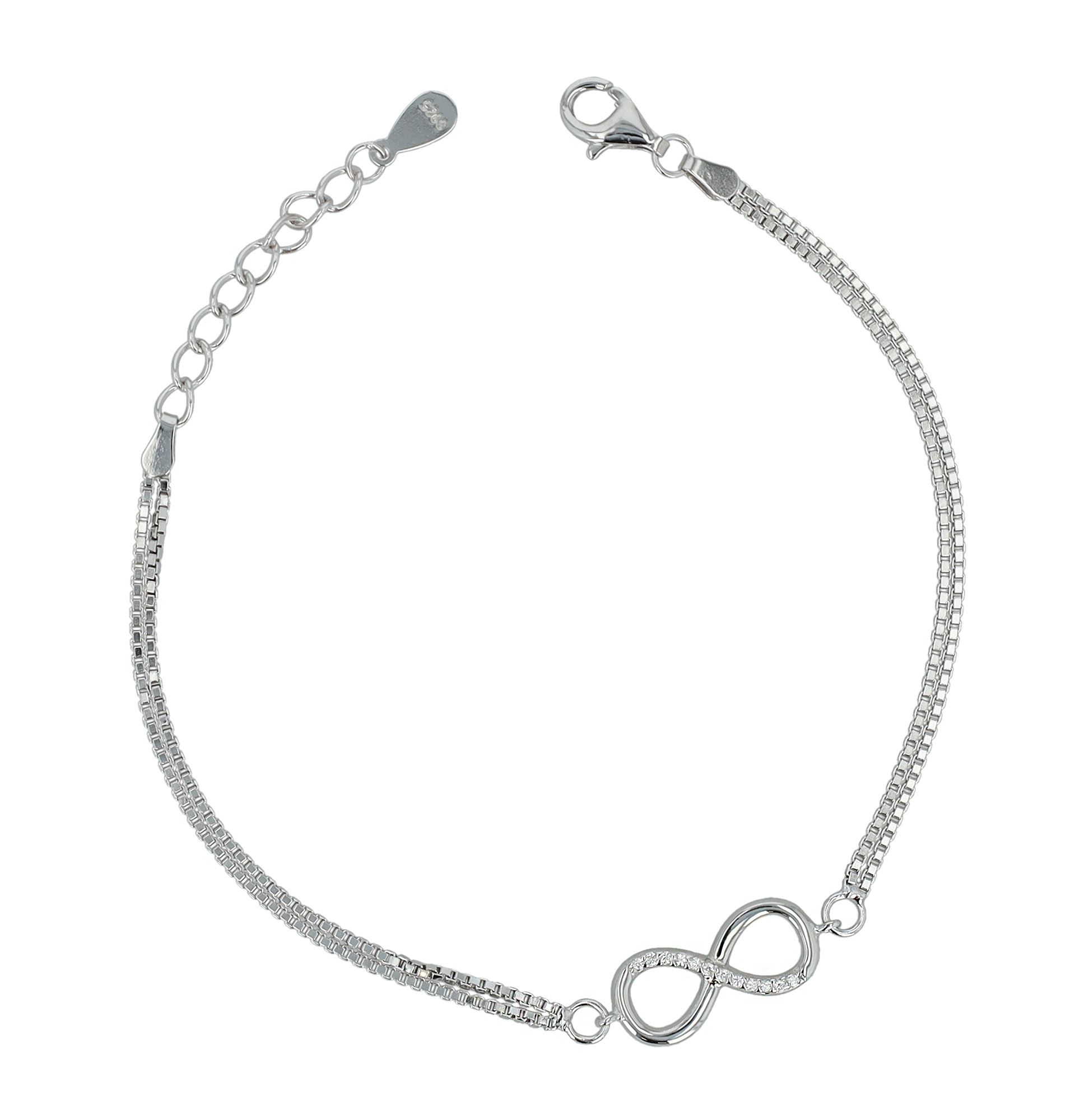 Das zweireihige Armband zeichnet sich durch seine feinen Ketten aus, die in der Mitte von einem Infinity-Symbol zusammengeführt werden. Dieses Symbol, mit Zirkoniasteinen besetzt, fängt das Licht mit jeder Bewegung ein und sorgt für einen beeindruckenden Glanz. Mit einer Länge von 17 cm, ergänzt durch ein zusätzliches 3 cm langes Verlängerungselement, passt dieses Armband bequem um die meisten Handgelenke.