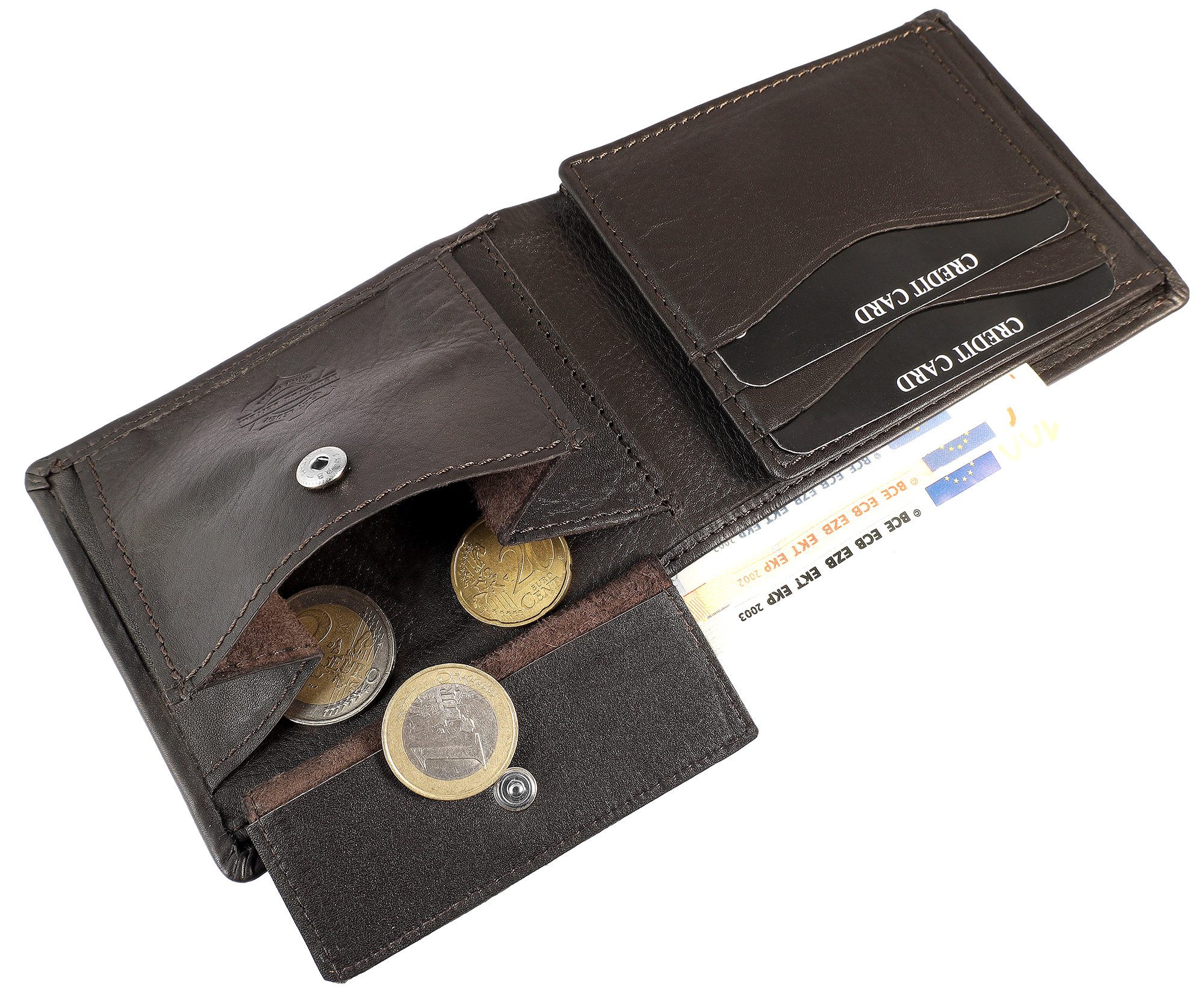 - Ein Münzfach mit Druckknopf, das Kleingeld sicher verwahrt und leicht zugänglich macht