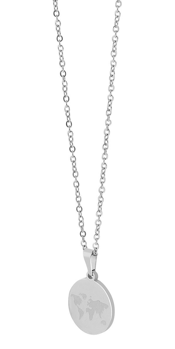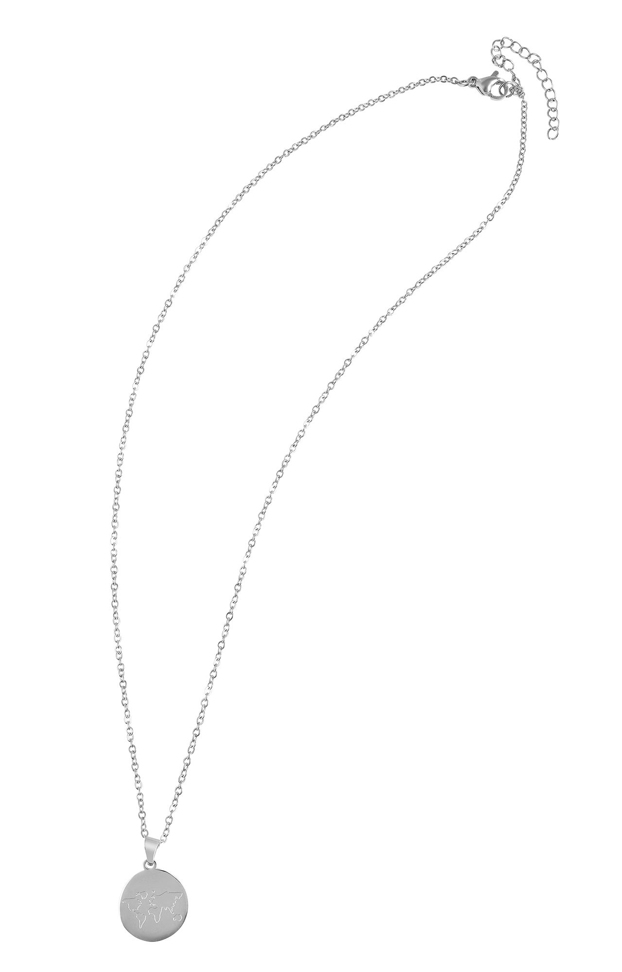 Unsere Halskette der Marke Akzent ist aus hochwertigem Edelstahl gefertigt und hat eine Gesamtlänge von 43 cm, ergänzt durch eine 5 cm lange Verlängerungskette. An dieser stilvollen Kette hängt ein runder Münzanhänger mit einer detailreichen Weltkarte. Der Anhänger hat einen Durchmesser von 15 mm und eine Stärke von 1 mm und bietet auf der Rückseite Platz für eine individuelle Gravur.