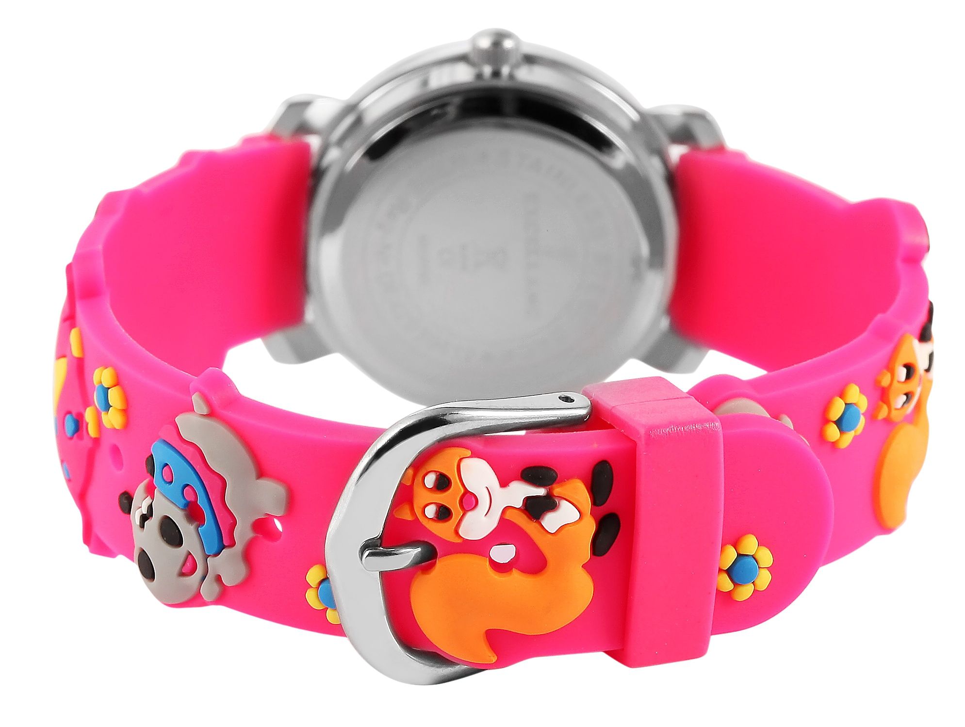 Die analoge 3-Zeiger Kinderarmbanduhr der Marke Excellanc verfügt über das hochwertige Quarzuhrwerk PC21. Das Silikonarmband ist am Anstoß 14 mm breit und lässt sich mit einer Dornschließe öffnen und schließen. Die Gesamtlänge der Uhr beträgt 20 cm. Das silberfarbene Metallgehäuse mit Mineralglas hat eine Abmessung von 27 mm im Durchmesser und einer Gehäusehöhe von 10 mm. Der Gehäuseboden ist aus Edelstahl gefertigt. Das pinke Kautschukarmband ist mit Tiermotiven verziert und sorgt für einen angenehmen Tragekomfort. Das weiße Zifferblatt ist mit bunten Ziffern bedruckt. Der Stundenzeiger ist rot und der Minutenzeiger ist blau. Die Sekunden werden mit einem gelben Zeiger angezeigt.