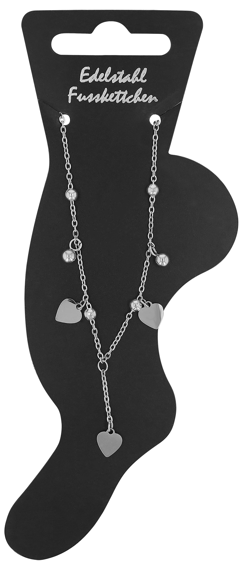 Deze bijzondere enkelband van hoogwaardig roestvrij staal maakt indruk met zijn fijne afwerking en innemende charme. Met een lengte van 21 cm en een royale verlenging van 5 cm biedt deze enkelband een pasvorm op maat voor de meest uiteenlopende enkels. De veilige karabijnsluiting zorgt voor comfort en betrouwbaarheid, waardoor dit sieraad een praktisch accessoire is. In het midden van deze ketting zit de hartenhanger aan een ketting van 2 cm, rechts en links omlijst door twee hangende hartjes. De ketting is ook versierd met gelijkmatig verspreide hangende en vaste roestvrijstalen bollen, die perfect passen in het harmonieuze ontwerp. Een sieraad met een discrete maar effectieve uitstraling.