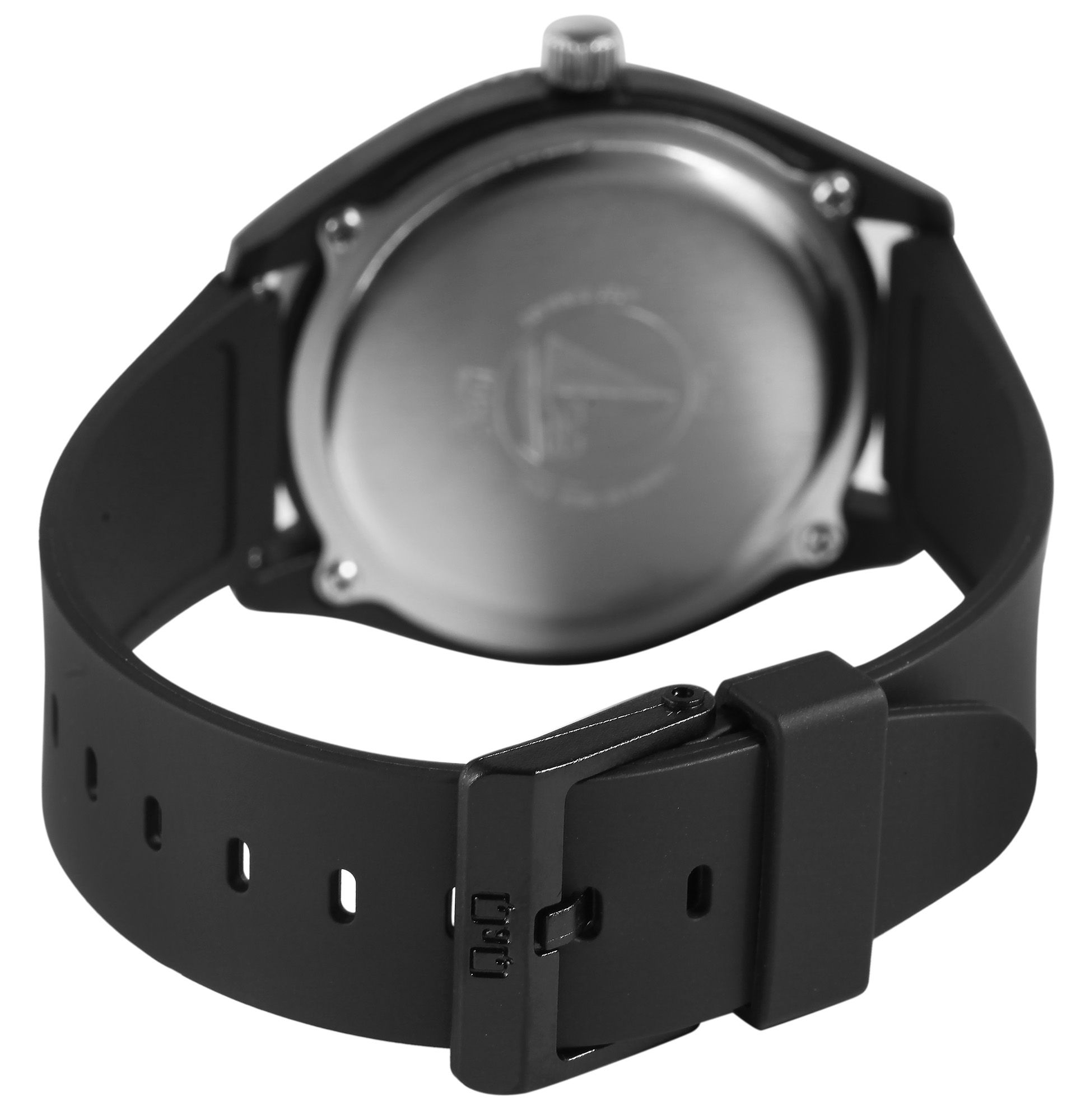 Die analoge 3-Zeiger Herrenuhr der Marke Q&Q - by Citizen Watch Co. LTD verfügt über ein hochwertiges und ganggenaues Quarzuhrwerk. Das schwarze Silikonarmband ist am Anstoß 21 mm breit und lässt sich mit einer schwarzen Dornschließe öffnen und schließen. Die Gesamtlänge der Uhr beträgt 25 cm. Das schwarze Kunststoffgehäuse mit Mineralglas hat eine Abmessung von 41 mm im Durchmesser und einer Gehäusehöhe von 11 mm. Der Gehäuseboden ist aus Edelstahl gefertigt und mit vier Edelstahlschrauben am Gehäuse befestigt. Die Uhrzeit lässt sich durch das schwarze Zifferblatt mit grünen Ziffern im arabischen Stil ideal ablesen. Dank der mit Superluminova beschichteten Zeiger ist dies auch im Dunkeln möglich. Des Weiteren bietet die Armbanduhr durch das weiche Silikonarmband einen angenehmen Tragekomfort und lässt sich durch das sportliche Design wunderbar kombinieren. Zudem erweist sich das Material als besonders hautfreundlich und eignet sich dadurch ideal für Allergiker.