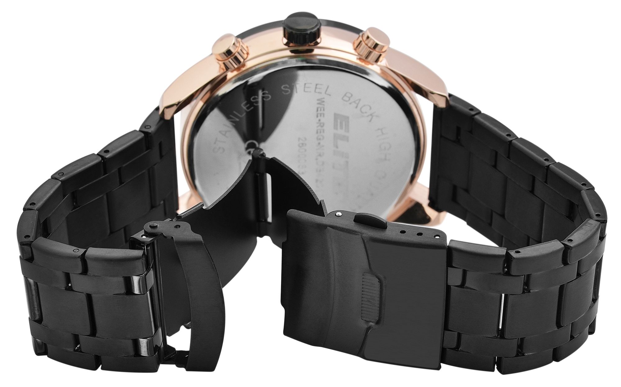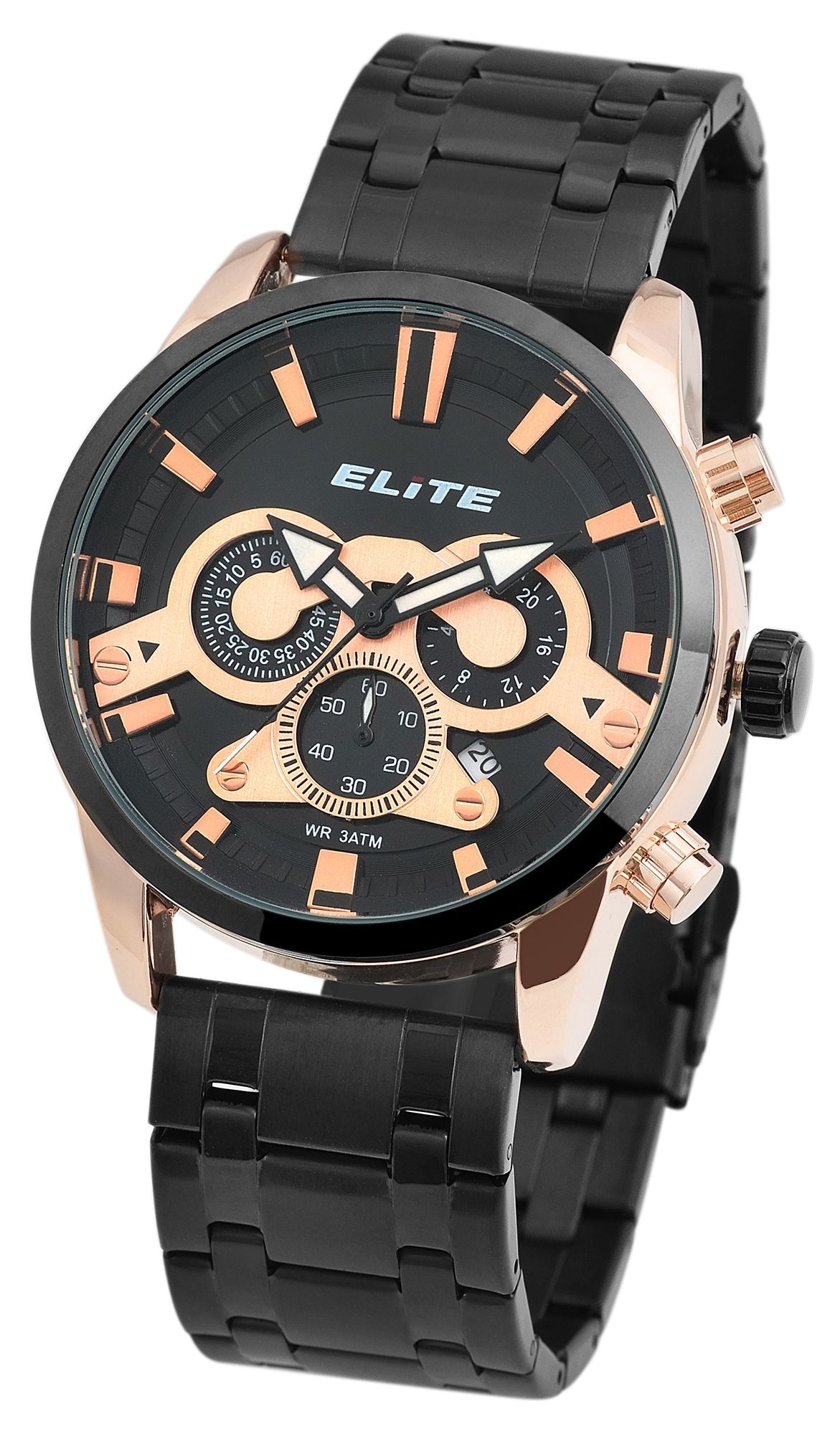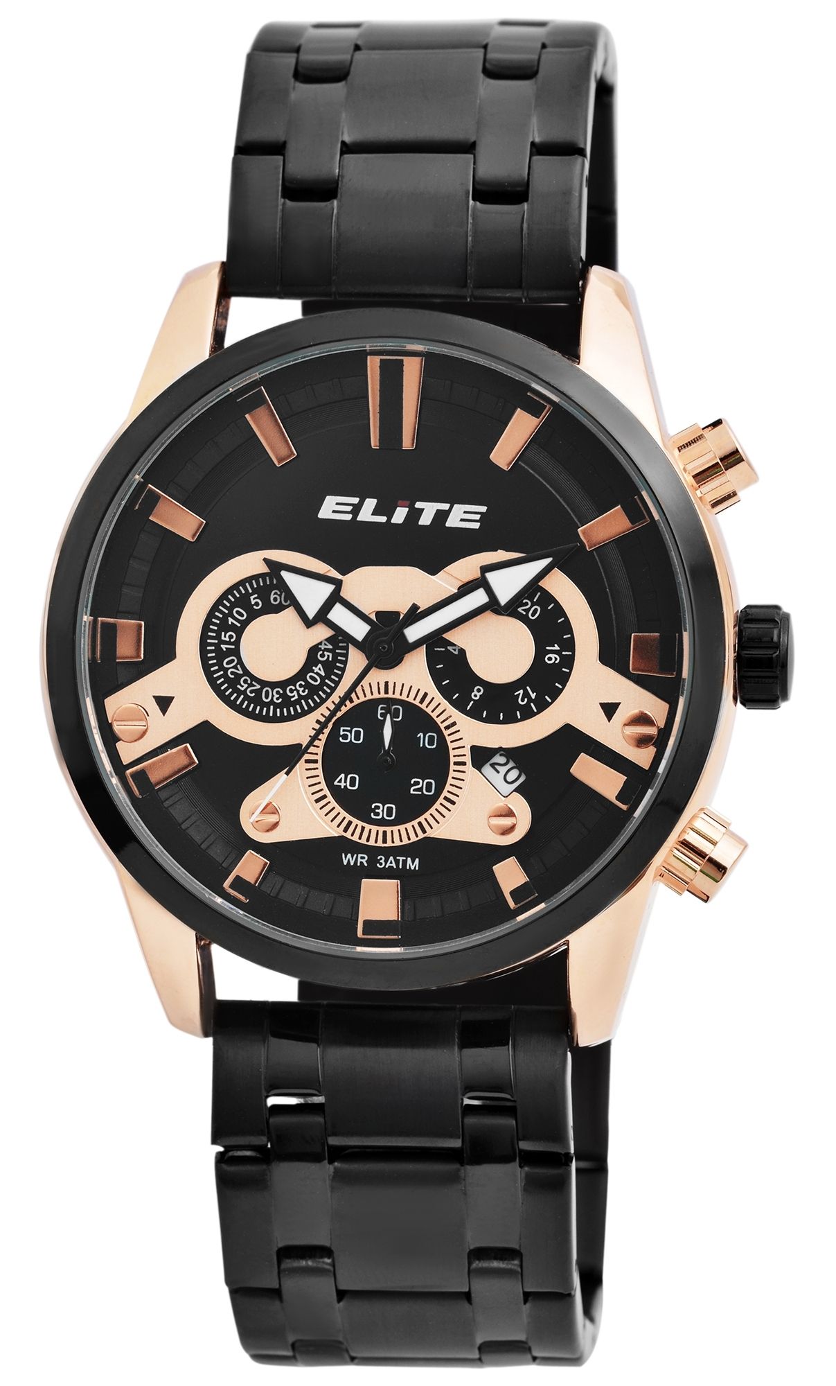 Elite Herren Chronograph mit Metallband, 3ATM, Schwarz/ roségoldfarbig