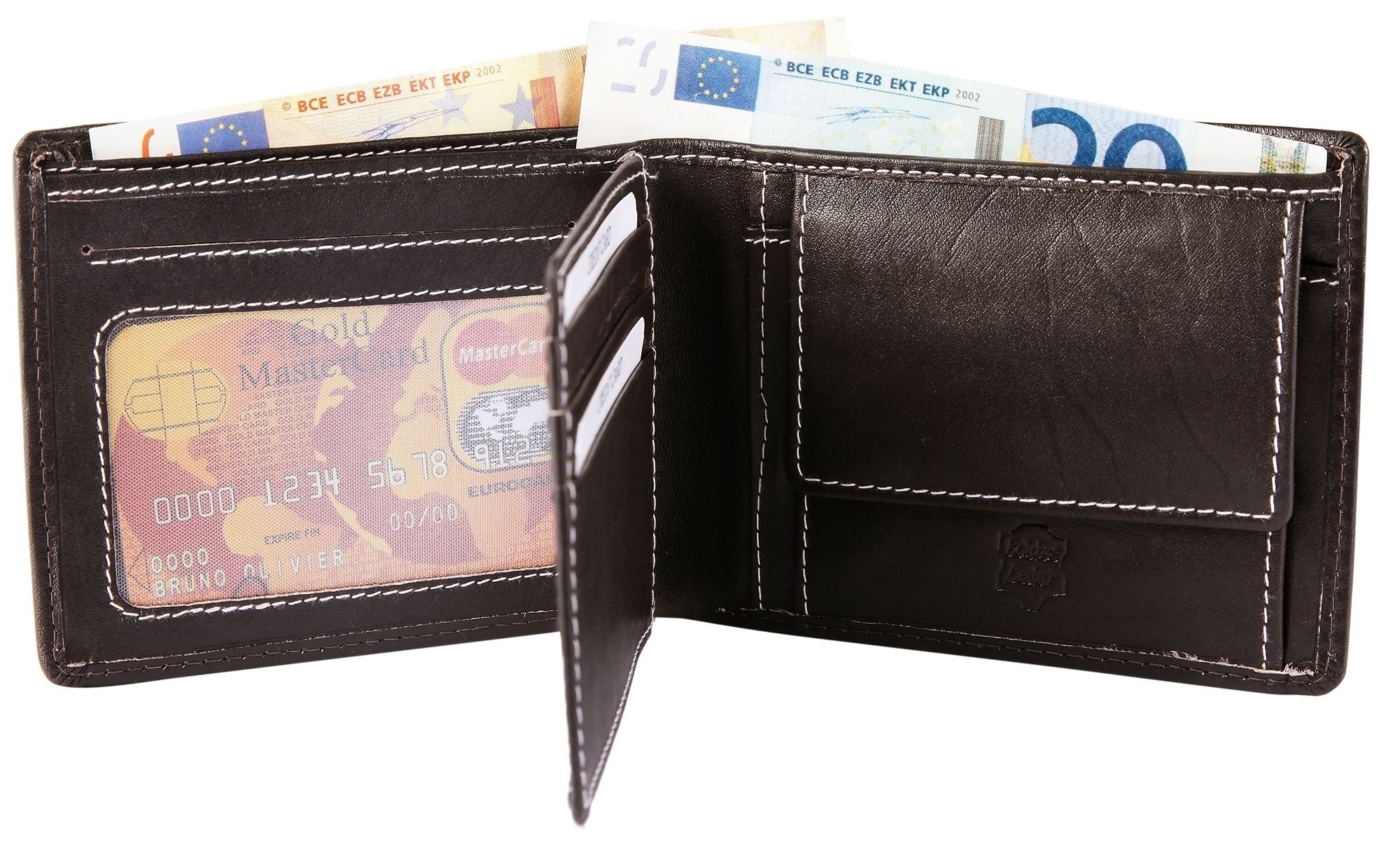 Akzent Herren Geldbörse aus Echtleder. Die Querformat-Geldbörse ist 12 cm breit und 9 cm hoch. Die Farbe ist Dunkelbraun. Sie verfügt über 2 Geldscheinfächer, ein Kleingeldfach, 5 Kreditkartenfächer, ein transparentes Kreditkartenfach und ein transparentes Ausweisfach.