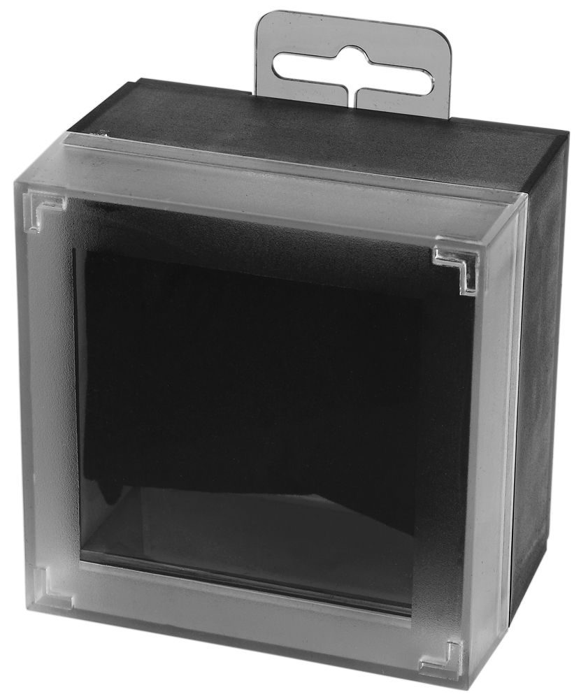 Productinformatie "Uhrenbox aus Kunststoff, schwarz/transparent, aufhängbar, 88 x 88 x 61 mm"