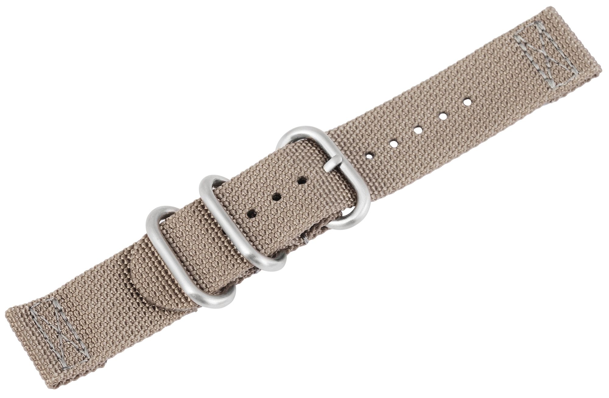 De taupekleurige nylon horlogeband is verkrijgbaar met een nokbreedte van 20 mm en 22 mm. Het kan eenvoudig aan de horlogekast worden bevestigd met twee standaard veerpennen. Het horlogebandje heeft een totale lengte van 21,5 cm. Het bandje kan worden geopend en gesloten met een zilverkleurige gesp. Twee zilverkleurige metalen lussen zijn ook stevig aan het horlogebandje genaaid. Het zachte materiaal maakt de horlogeband bijzonder comfortabel om te dragen. Het eenvoudige uiterlijk maakt het mogelijk om het vervangende horlogebandje aan elk type horloge te bevestigen. Het past goed bij het algemene uiterlijk van de horloges.