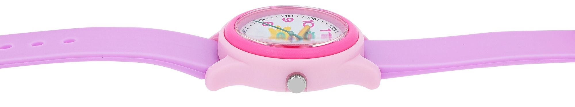 Diese mädchenhafte Kinderuhr mit Silikonarmband und floralen Motiven überzeugt mit einem präzisen und hochwertigen Quarzuhrwerk, das nicht nur für Genauigkeit sorgt, sondern auch eine langanhaltende Zuverlässigkeit garantiert. Die beeindruckende Wasserbeständigkeit von 10 ATM macht diese Uhr perfekt für abenteuerlustige Kinder, die gerne planschen und spielen. Das lila Silikonarmband verleiht nicht nur einen bequemen Sitz, sondern auch einen verspielten Touch, der kleine Herzen höherschlagen lässt. Die Dornschließe in zartem Rosa fügt einen Hauch von verspielter Eleganz hinzu und gewährleistet einen sicheren Halt. Das Kunststoffgehäuse in Rosa, kombiniert mit einer pinken Lünette, setzt einen modischen Akzent und macht diese Mädchenuhr zu einem wahren Schmuckstück. Das Zifferblatt ist mit bezaubernden Blumenmotiven verziert, die die Fantasie der kleinen Trägerinnen beflügeln. Mit einem Gehäusedurchmesser von 32 mm, einer Gehäusehöhe von 10 mm und einer Bandbreite von 16 mm ist sie speziell für zarte Handgelenke gemacht. Die Gesamtlänge von 22,5 cm sorgt dafür, dass die Uhr bequem getragen werden kann.