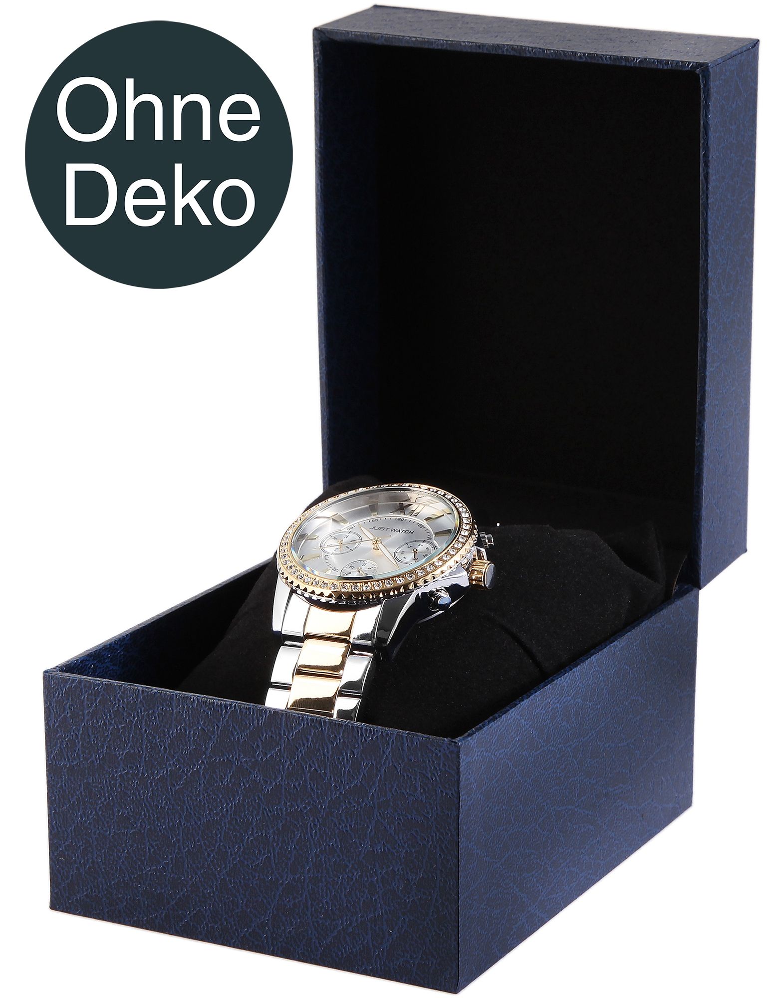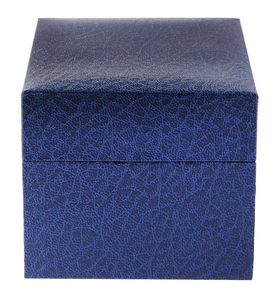 Die dunkelblaue Uhrenbox zum Aufklappen wurde aus hochwertigem und robustem Karton gefertigt. Durch das mit Struktur versehenes Oberflächenfinish bekommen die Boxen ein stilvolles und elegantes Design, sodass nicht nur die Qualität überzeugt, sondern auch die Optik. Im Inneren befindet sich ein samtbezogenes Uhrenkissen in Schwarz, welches für eine ordentliche Aufbewahrung von Damen- und Herrenuhren dient. Die Box eignet sich hervorragend zur Präsentation und Aufbewahrung von Uhren jeglicher Art und ist natürlich auch perfekt zum Verschenken. Die Größe ergibt sich aus einer Länge von 11 cm, einer Breite von 8,8 cm und einer Höhe von 7,7 cm.