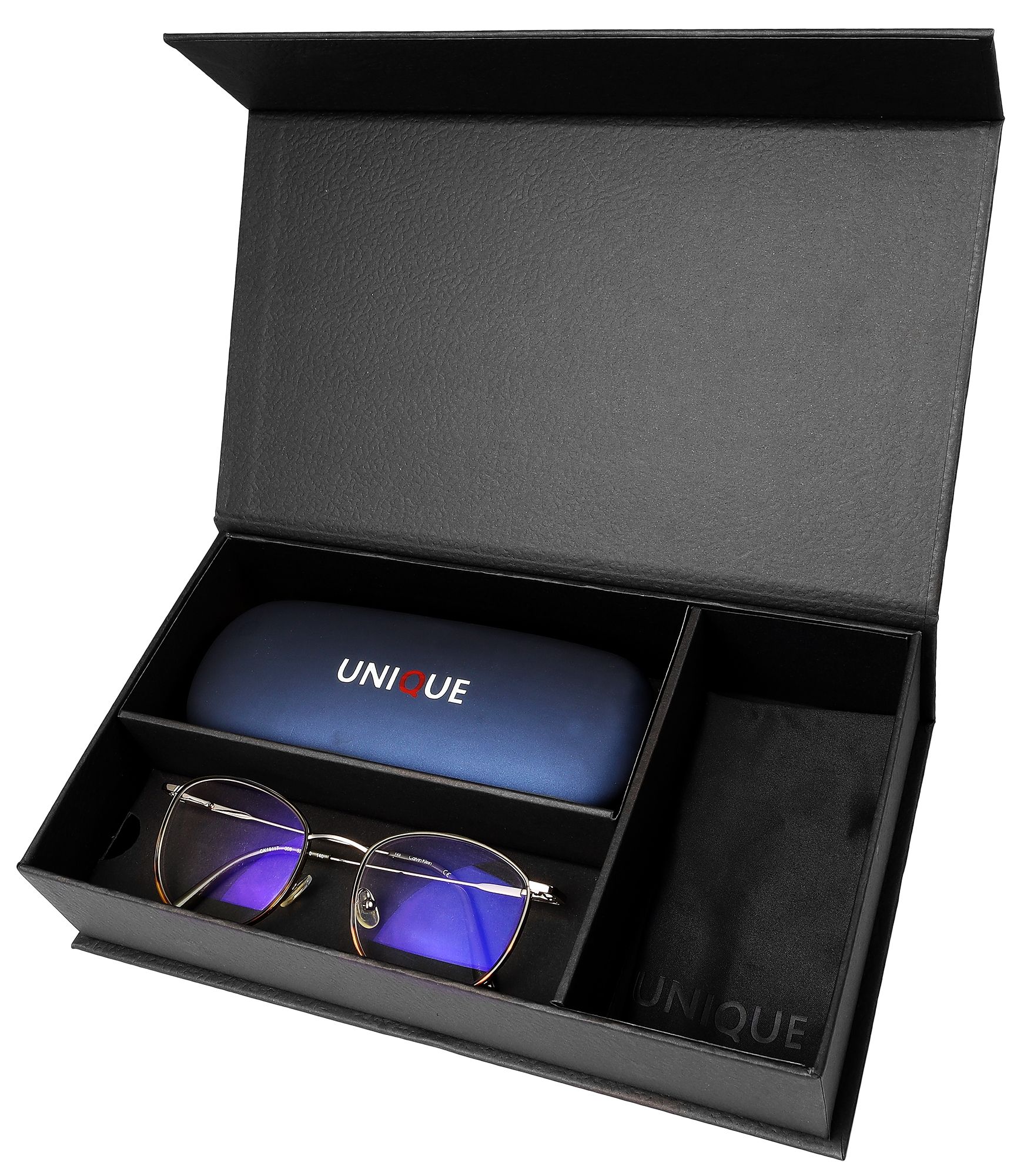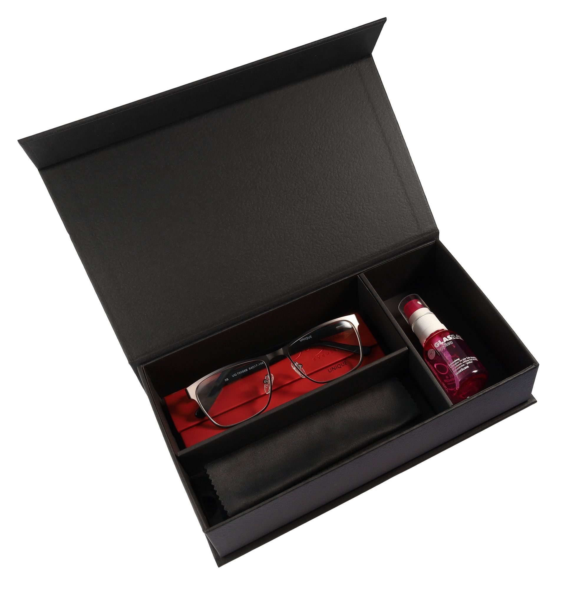 Bewahren Sie Ihre Brillen und Zubehör stilvoll und sicher auf in unserer hochwertigen Brillenbox, die speziell dafür entworfen wurde, Ordnung und Schutz zu bieten. Diese vielseitige Box aus erstklassiger, schwarzer Pappe besticht durch ihre Langlebigkeit und ihr elegantes Design. Sie misst 14,5 x 25,5 x 5 cm und bietet mit ihren drei verschieden großen Fächern ausreichend Platz für Ihre Brillen, Etuis, Reinigungstücher und Pflegemittel. Der aufklappbare Deckel ist mit einem praktischen Magnetverschluss ausgestattet, der ein einfaches Öffnen und sicheres Schließen ermöglicht. Ideal für die Aufbewahrung Ihrer Seh- und Sonnenbrillen sowie deren Zubehör, sorgt diese Box nicht nur für Ordnung und Schutz Ihrer Brillen, sondern fügt sich auch stilvoll in jede Einrichtung ein.