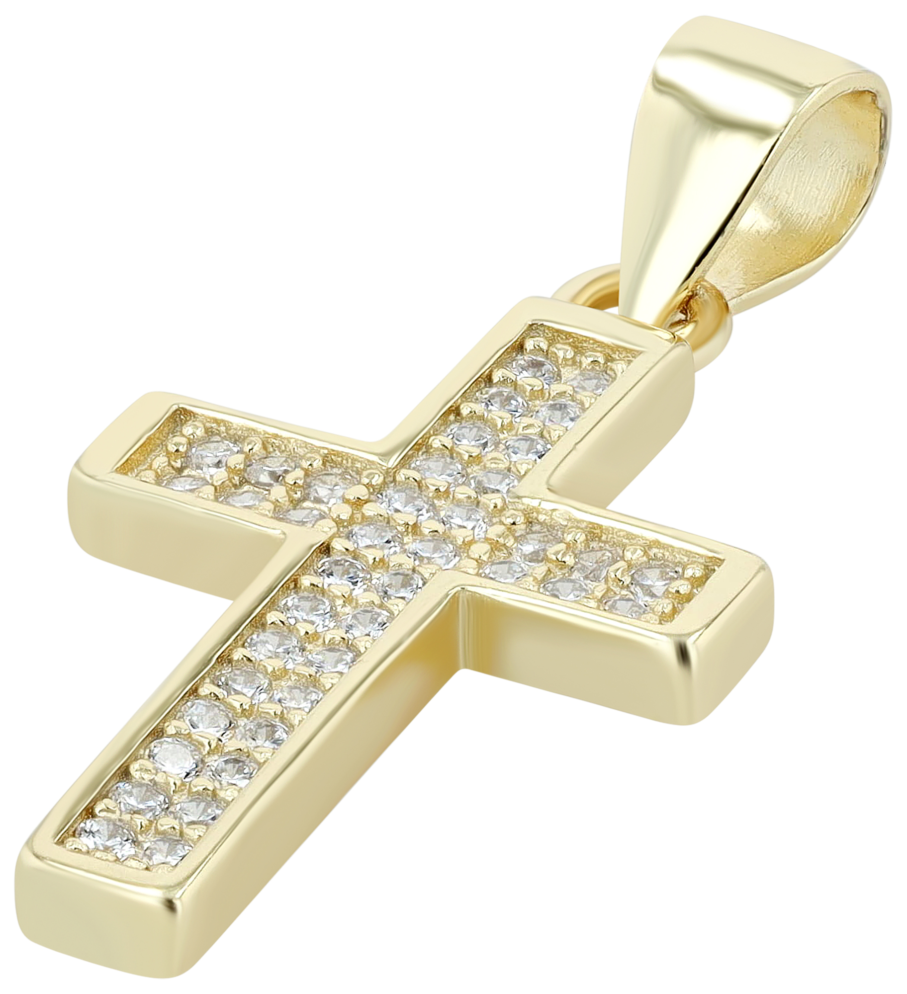 Der Kettenanhänger in Form eines Kreuzes wurde aus 925/- Sterlingsilber hergestellt und ist zusätzlich mit einer Rhodiumschicht oder einer Vergoldung versehen. Diese hochwertige Beschichtung schützt das Schmuckstück vor dem Anlaufen und verleiht ihm einen besonders hohen Glanz. Das Kreuz ist mit 40 funkelnden Zirkoniasteinen geschmückt. Dieses feine Detail verleiht dem Anhänger eine schlichte Eleganz, es ist das perfekte Accessoires für jeden Anlass und eignet sich ideal zum Verschenken, beispielsweise zur Kommunion, Firmung oder Taufe. Dank einer ovalen Öse lässt sich der Anhänger beliebig an verschiedenen Ketten anbringen. Bitte beachten Sie bei dem Erwerb dieses Produktes darauf, dass die Halskette nicht im Lieferumfang enthalten ist. Die Maße ergeben sich aus einer Länge von 20 mm, einer Breite von 12 mm und einer Stärke von 2 mm. Dieses Produkt wird auf einem weißen Schmuckkärtchen geliefert. Es hat eine Maße von 45 x 35 mm und eignet sich ideal zum Präsentieren in dem dazu geeigneten Display oder zum Verpacken als Geschenk.