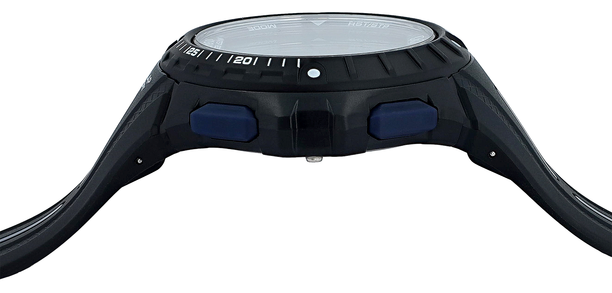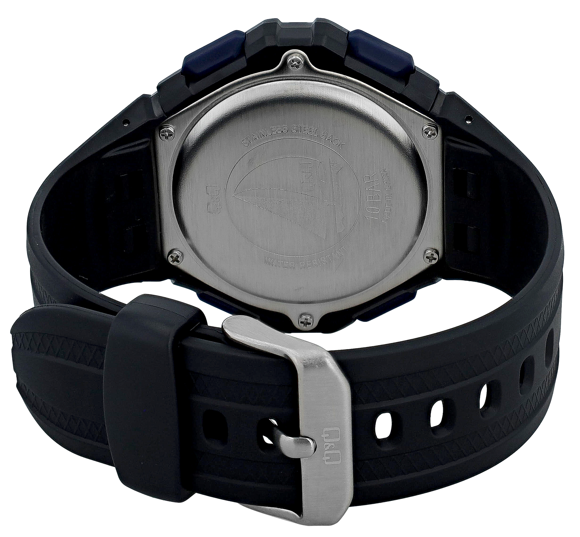 Diese Q&Q - by Citizen Watch Co. LTD (by Citizen Watch Co. LTD) Herren Digitaluhr repräsentiert die perfekte Symbiose aus robustem Design und hochfunktionaler Technologie. Sie wurde speziell für den anspruchsvollen, aktiven Mann konzipiert, der einen zuverlässigen und stilvollen Begleiter für Sport, Abenteuer und den täglichen Einsatz sucht. Das Erscheinungsbild der Uhr, zeichnet sich durch sein markantes, maskulines Design aus. Das schwarze Kunststoffgehäuse mit einem imposanten Durchmesser von 50 mm und einer Höhe von 14 mm zeigt sich modisch und schlicht mit Chronographenoptik auf der Lünette. Blaue Akzente an den Drückern und dezenten Streifen auf dem Resinarmband verleihen der Uhr eine dynamische, sportliche Note und brechen das Schwarz auf. Das Armband selbst ist breit und robust, mit einer Bandbreite am Steg von 30 mm, was nicht nur die markante Optik unterstreicht, sondern auch für höchsten Tragekomfort und Stabilität am Handgelenk sorgt. Die Gesamtlänge der Uhr von 22,5 cm gewährleistet eine optimale Passform. Eine klassische Edelstahl-Dornschließe ermöglicht perfekten Halt.