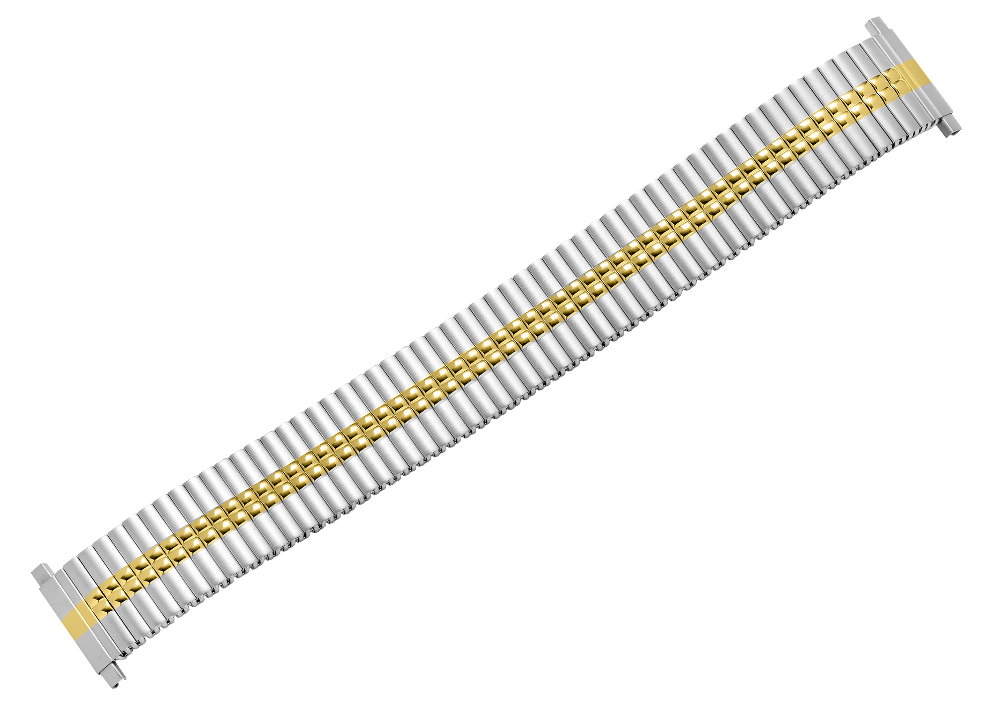 Ein modisches und flexibles Unisex Armband in edlem Silberton mit goldfarbenen Akzenten im Mittelteil, welches sich zu jeder Gelegenheit tragen lässt, sollte bei keinem Uhrenliebhaber fehlen. Dieses schlichte Schmuckstück zeigt einen gebürsteten, matten Randteil in silberfarbener Optik und einen durch Polierung hervorgehobenen Mittelteil in edlem Goldton. Der polierte Teil hebt sich zusätzlich auch durch haptisch ertastbare Auswölbungen ab.