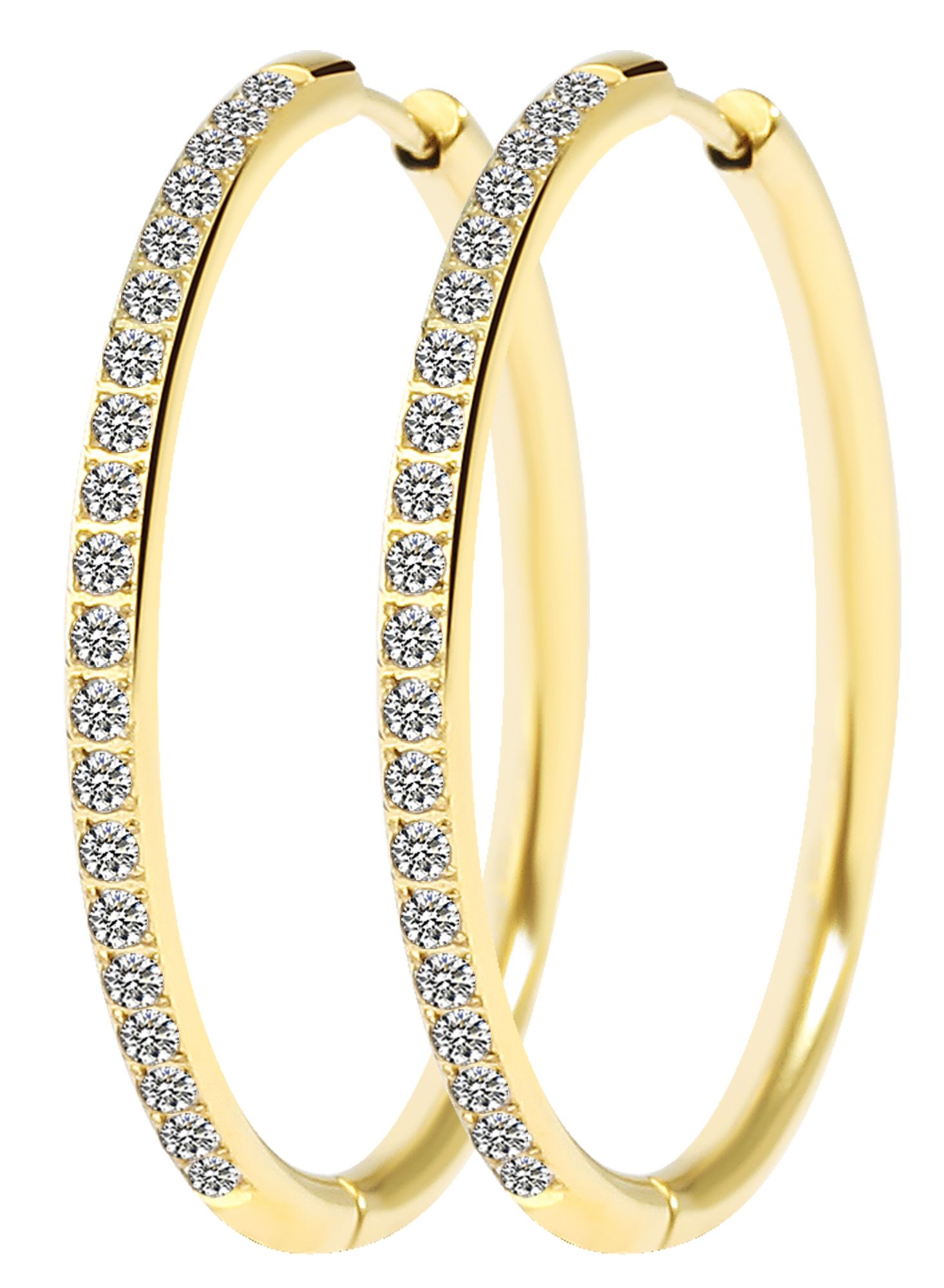 Diese mittelgroße Creole mit einem Innendurchmesser von 30 mm (Breite und Stärke 2,5 mm) ist groß genug für einen beeindruckenden Auftritt und trotzdem alltagstauglich. Der funkelnde Similibesatz auf der Vorderseite macht diese Edelstahl-Creolen zu einem echten Hingucker.