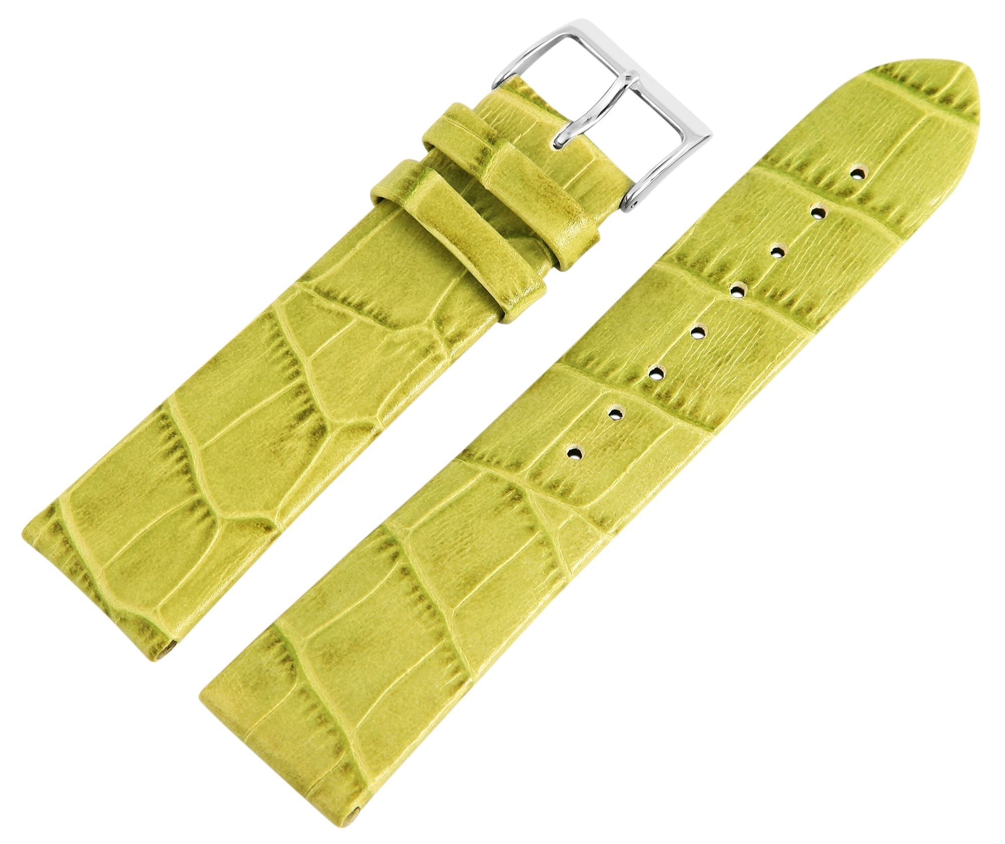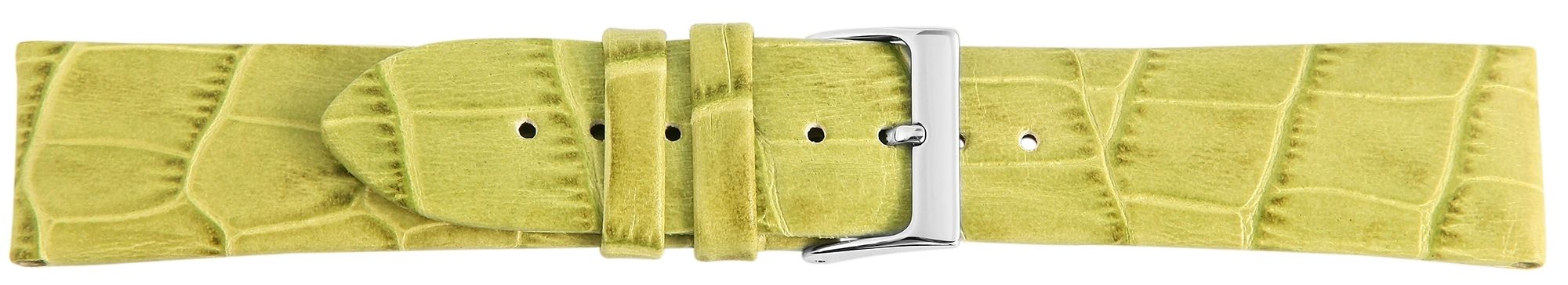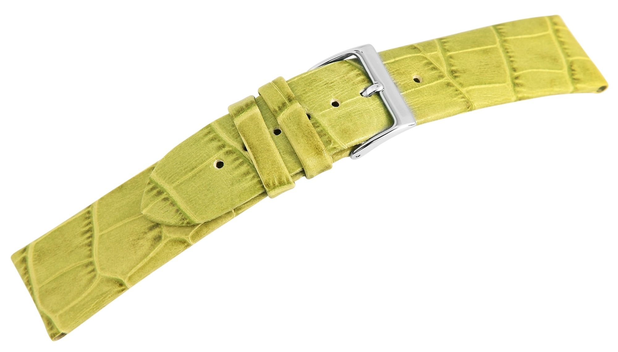Klassisches Echtleder Ersatzarmband in der Farbe Hellgrün. Es ist aus feinstem Rindsleder hergestellt und im Alligatorlederdesign geprägt. Das Armband besitzt eine Stegbreite von 22 mm, eine silberfarbige Dornschließe sowie zwei Armbandschlaufen. Der Lochteil läuft am Ende spitz zu.