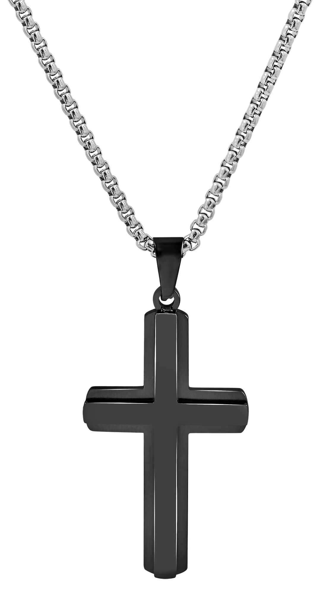 Der schwarze Anhänger der Marke Akzent in Form eines Kreuzes wurde aus Edelstahl gefertigt und mit einer hochwertigen Ionenplattierung veredelt. Das Material ist sehr robust, langlebig und eignet sich ideal für Allergiker, da sich Edelstahl als besonders hautverträglich erweist. Das Design des Anhängers wird durch einen sogenannten "Twin-Look" aufgewertet. Dabei ist auf dem Kreuzanhänger ein weiteres Kreuzelement aus Edelstahl angebracht und hebt sich gekonnt hervor. Das Kreuz besteht aus einem mattierten und polierten Finish und kann beliebig mit filigranen Gravuren versehen werden. Die Kombination aus mattierten und glänzenden Elementen machen diesen Anhänger dabei zu einem besonderen Accessoire. Aufgrund der ovalen Öse lässt sich dieser Anhänger mit jeder Art von Halskette kombinieren und somit im Handumdrehen ein neuer Look kreieren. Bitte beachten Sie, dass eine Kette nicht im Lieferumfang enthalten ist. Das Edelstahlkreuz hat eine Länge von 49 mm, eine Breite von 27 mm und eine Materialstärke von 3,5 mm.
