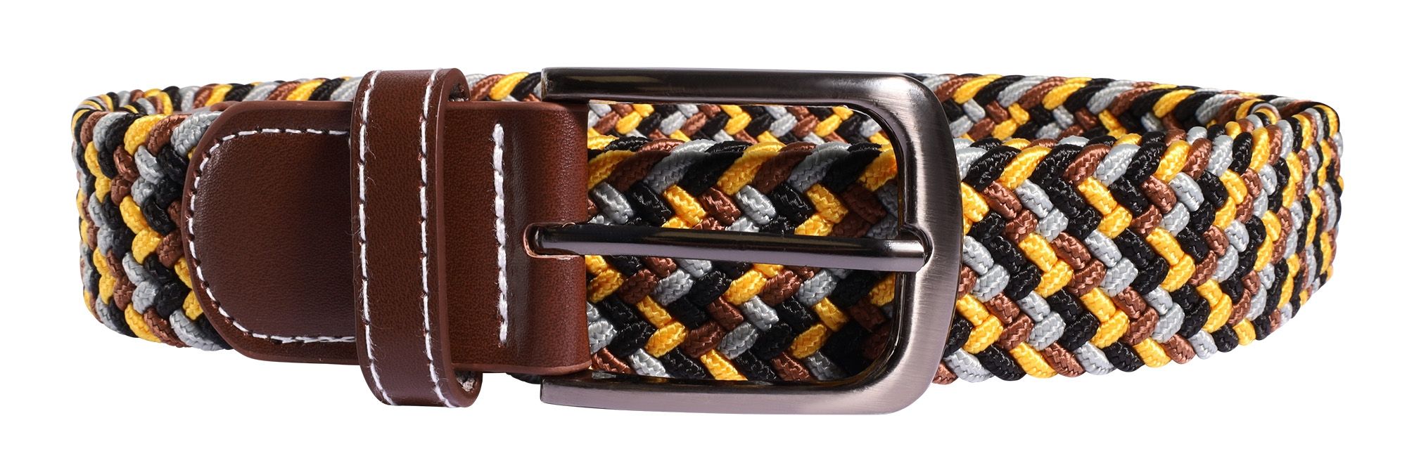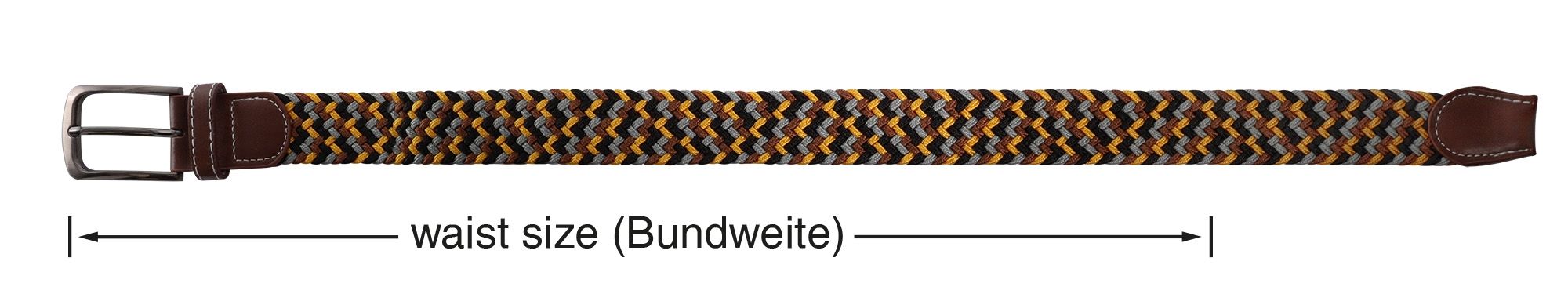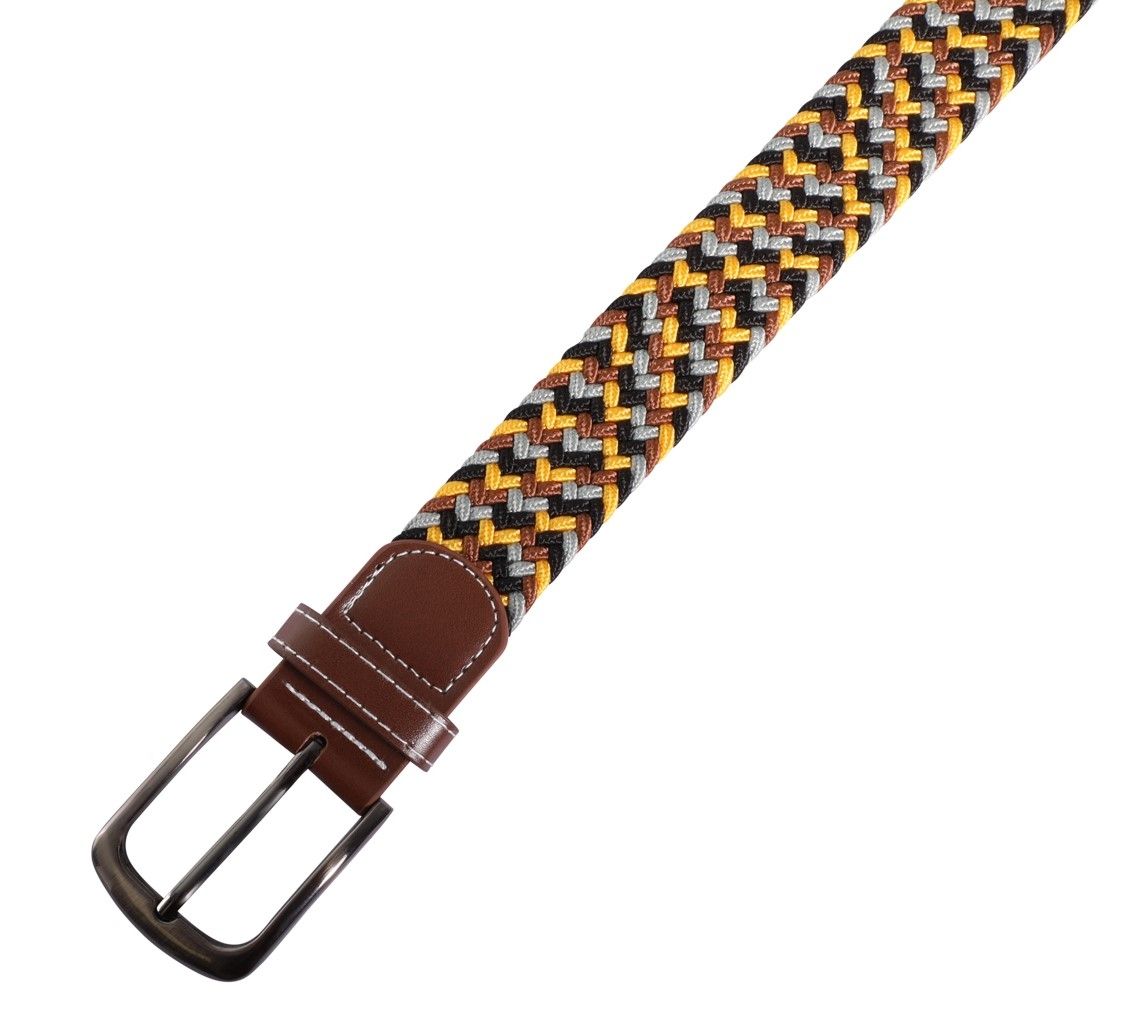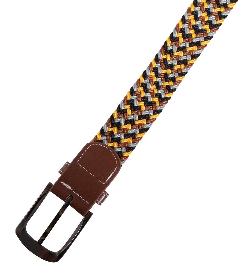 Onze hoogwaardige stoffen riemen met het onmiskenbare gevlochten patroon en de perfect op elkaar afgestemde kleuren geel, bruin, grijs en zwart zijn de perfecte partner voor jeans en T-shirts. Beide uiteinden van de riem zijn verstevigd met bruine kunstlederen applicaties, wat de riem een elegante touch geeft.