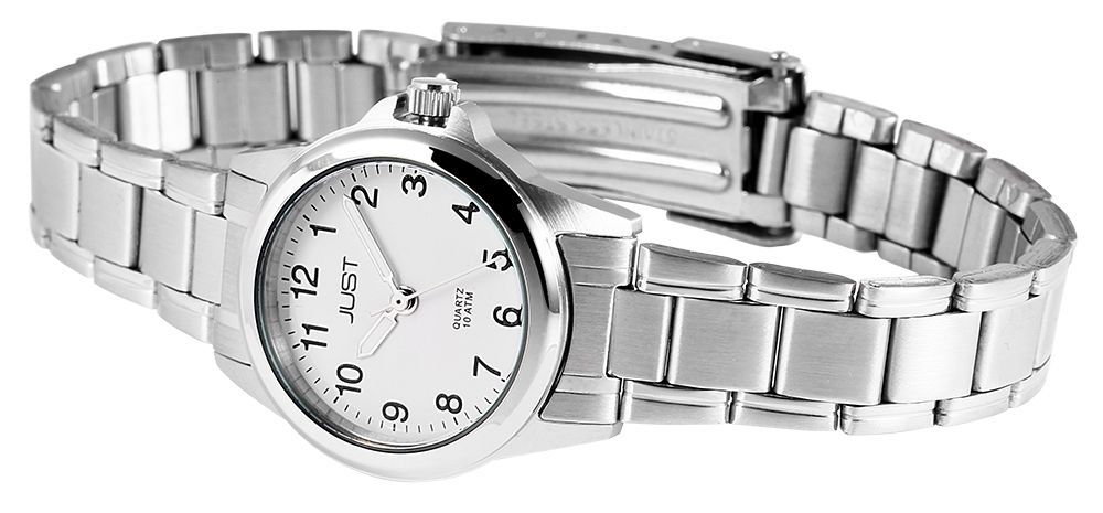 Het analoge 3-hands damespolshorloge van het merk Just heeft een hoogwaardig Miyota 2035 quartz uurwerk. De roestvrijstalen armband is 14 mm breed bij de lug en kan worden geopend en gesloten met een roestvrijstalen vouwsluiting. De totale lengte van het horloge is 20 cm. De roestvrijstalen kast met mineraalglas heeft een diameter van 27 mm en een kasthoogte van 9 mm. De achterkant van de kast is ook van roestvrij staal. De wijzerplaat is eenvoudig gehouden en de wijzers en cijfers hebben dezelfde kleur. Dankzij de Superluminova-gecoate wijzers is de tijd zelfs in het donker goed af te lezen. Het horloge heeft een waterdichtheid van 10 bar. Je ontvangt een garantiekaart en een originele doos van het merk Just als accessoires voor je product.