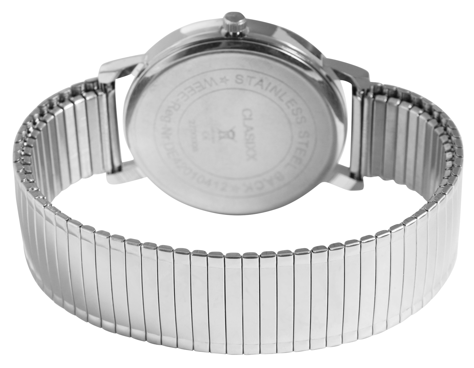 Die analoge 3-Zeiger Herrenarmbanduhr der Marke CLASIXX verfügt über ein hochwertiges Quarzuhrwerk. Das Edelstahlzugarmband ist am Anstoß 20 mm breit und lässt sich aufgrund des flexiblen Armbandes besonders bequem und einfach über das Handgelenk ziehen. Die Gesamtlänge der Uhr beträgt 21 cm. Das Metallgehäuse mit Mineralglas hat eine Abmessung von 38 mm im Durchmesser und einer Gehäusehöhe von 7 mm. Der Gehäuseboden ist aus Edelstahl gefertigt. Dank des schlichten Zifferblattes und der übersichtlichen Einteilung lässt sich die Uhrzeit schnell auf einen Blick ablesen. Dieses zeitlose Uhrenmodell ist ein wahrer Klassiker und gerade deswegen ideal als Geschenk für die Liebsten geeignet.