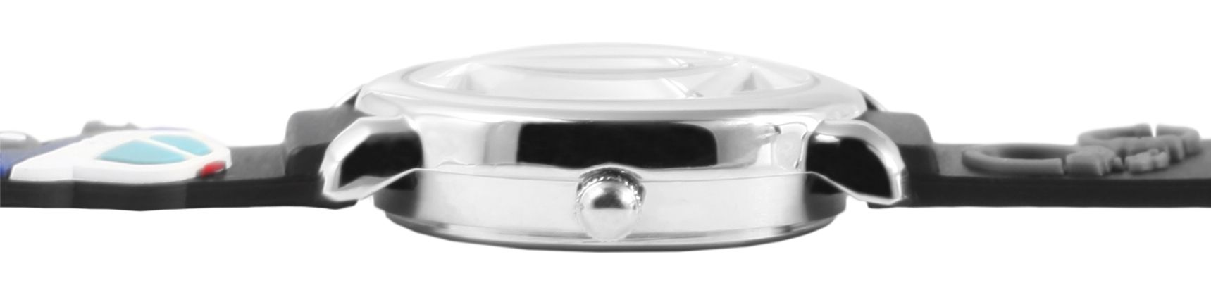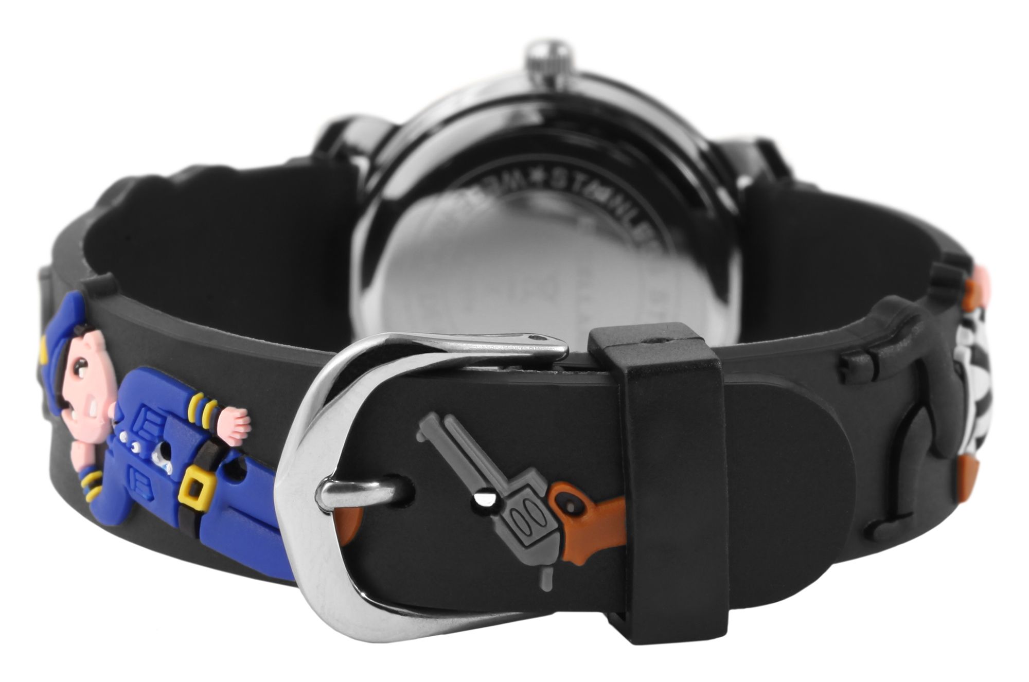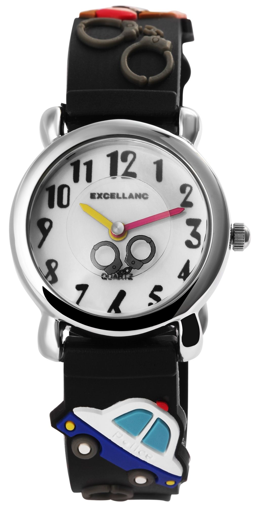Het analoge 3-hands kinderpolshorloge van het merk Excellanc heeft een hoogwaardig PC21 kwartsuurwerk. De siliconen band is 14 mm breed bij de lug en kan worden geopend en gesloten met een gesp. De totale lengte van het horloge is 20 cm. De metalen kast met mineraalglas heeft een diameter van 27 mm en een kasthoogte van 10 mm. De achterkant van de kast is gemaakt van roestvrij staal. De rubberen band is versierd met verschillende politiemotieven en is comfortabel om te dragen. De wijzerplaat is wit en bedrukt met zwarte cijfers. De uurwijzer is geel en de minutenwijzer is rood. De speciale secondewijzer bestaat uit een fijne transparante plaat met een kleine zwarte politiehandboei erop gedrukt.