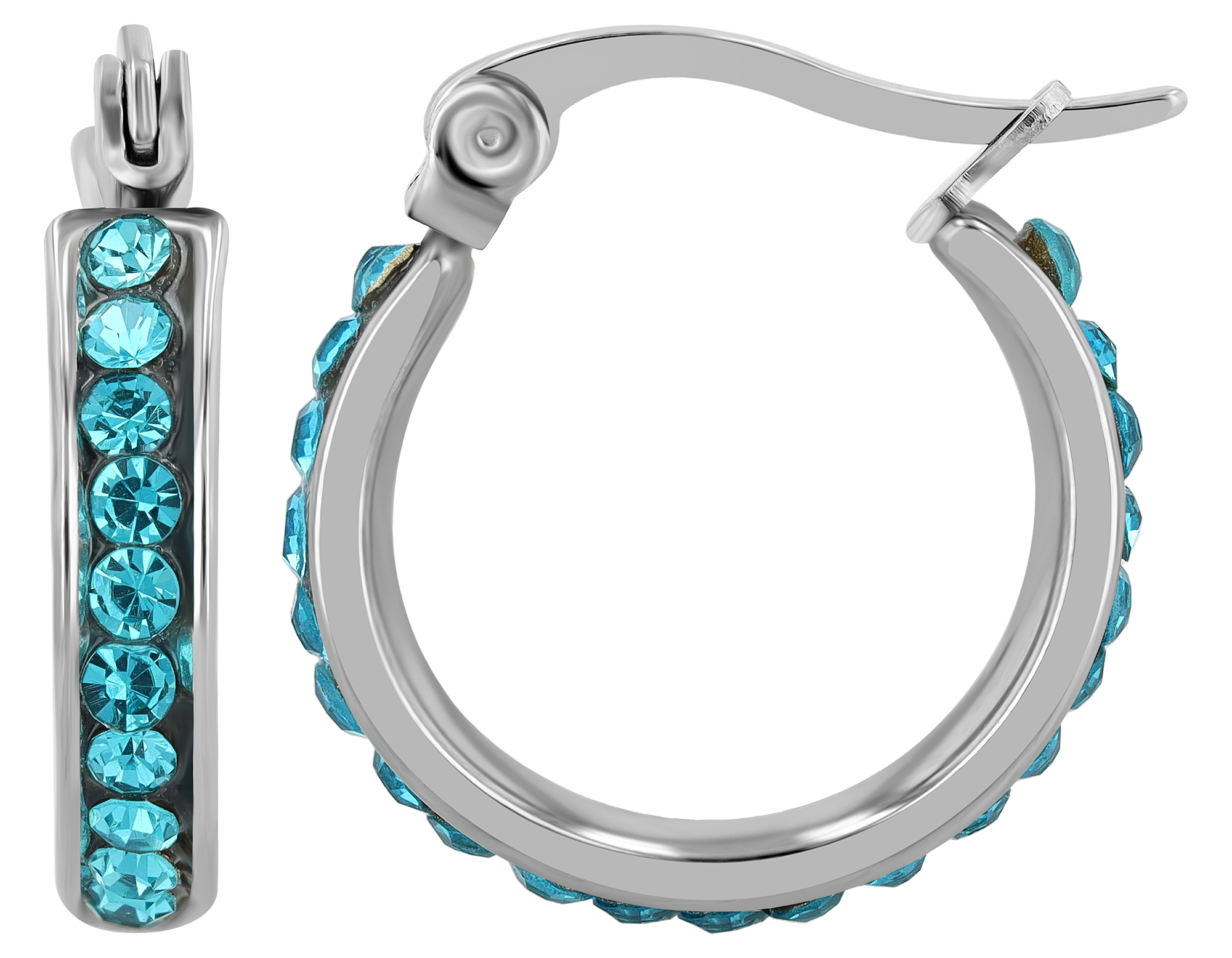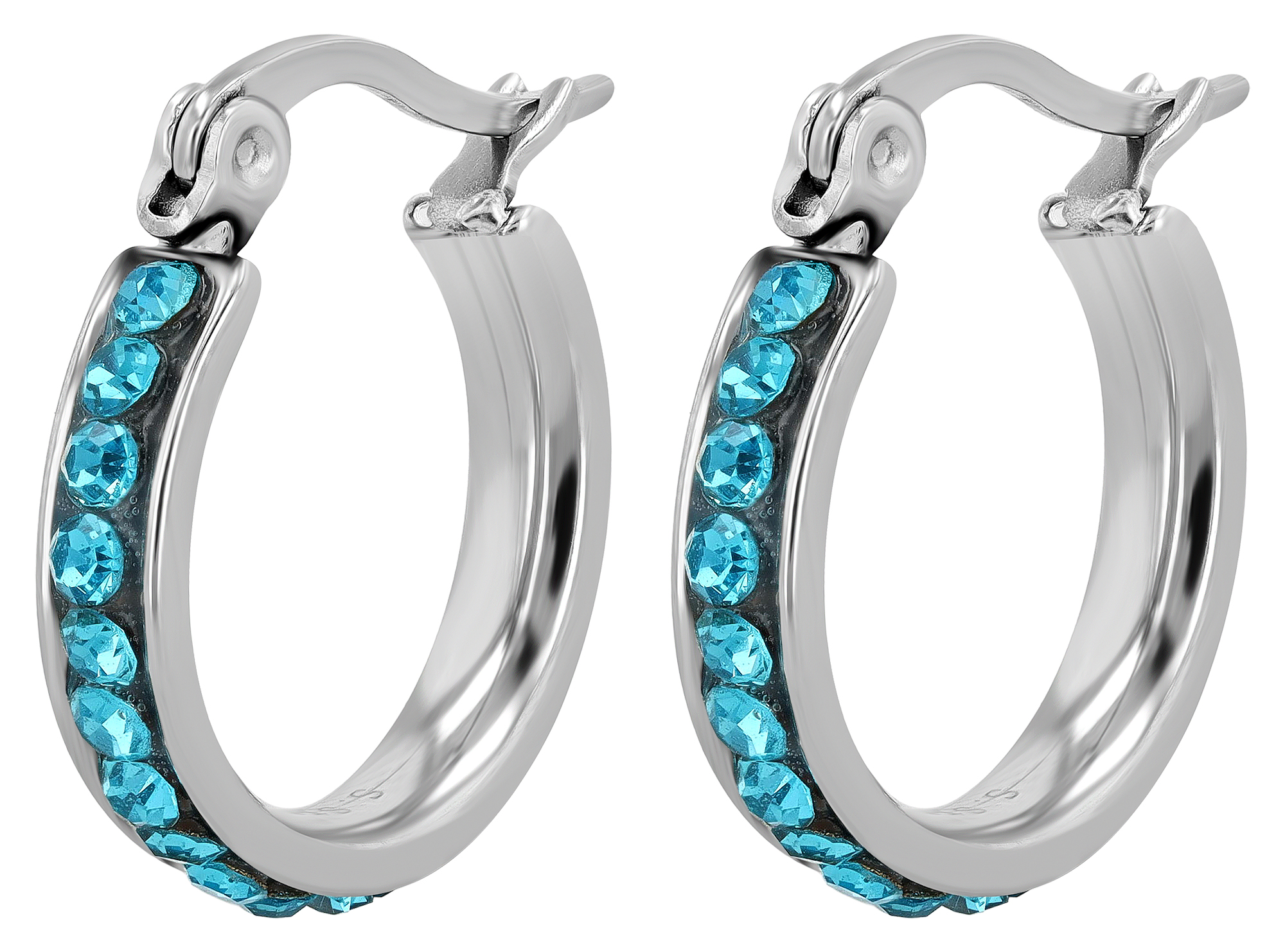 Die silberfarbenen Creolen der Marke Akzent sind aus Edelstahl gefertigt. Sie lassen sich mit einem klassischen Clipverschluss, der ebenfalls aus Edelstahl gefertigt ist, öffnen und schließen und sicher am Ohrloch befestigen. Die eleganten Ohrringe sind rundum mit 21 türkisfarbenen Similisteinen verziert. Diese verleihen dem Ohrschmuck farbliche Akzente und einen eleganten Look. Die Maße ergeben sich aus einem Durchmesser von 13 mm, einer Breite von 3,5 mm und einer Stärke von 2 mm.