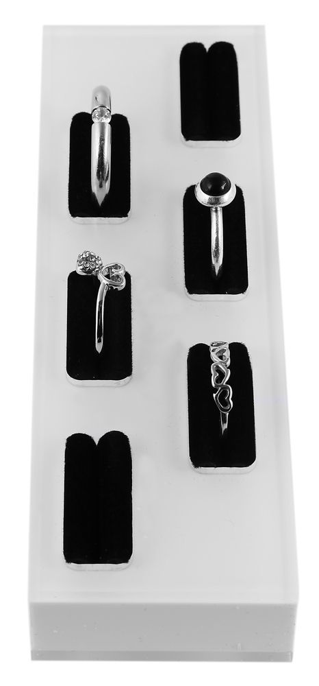 De ringendisplay is gemaakt van plastic. Er zijn zwarte inzetstukken voor de ringen in de witte display. Zo kunnen maximaal zes ringen worden gepresenteerd. De individuele inlays zijn bedekt met een fluwelen stof. Dankzij de bijzonder stabiele integratie van de ringinlays biedt de display de juiste houvast voor de ringen. Dit voorkomt dat ze er per ongeluk uitvallen of wegglijden. De display is verkrijgbaar in liggend formaat en eenmaal in lengterichting.