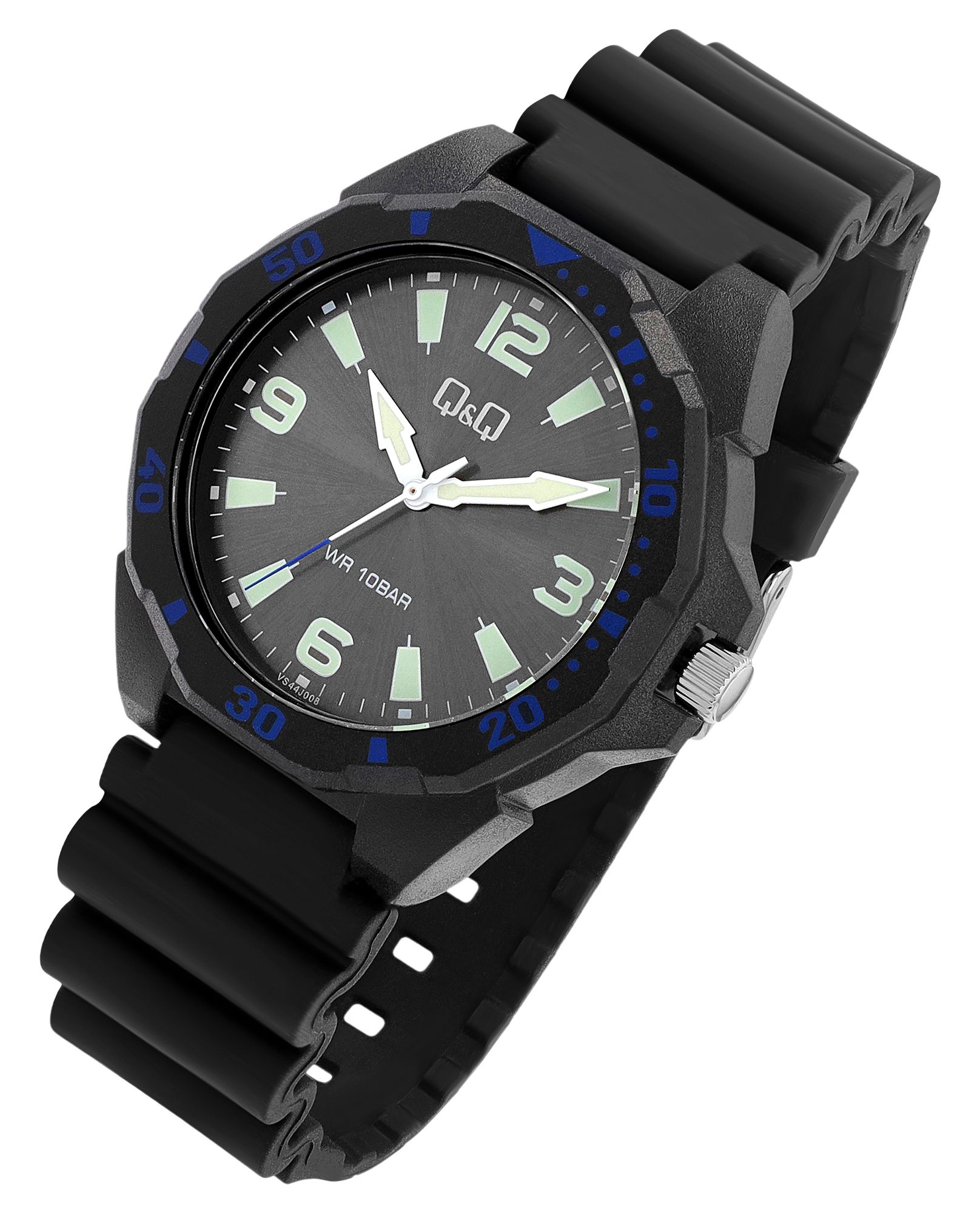 Productinformatie "Q&Q Herrenuhr, Resinband, Ø 43 mm, schwarz/ blaue Details"