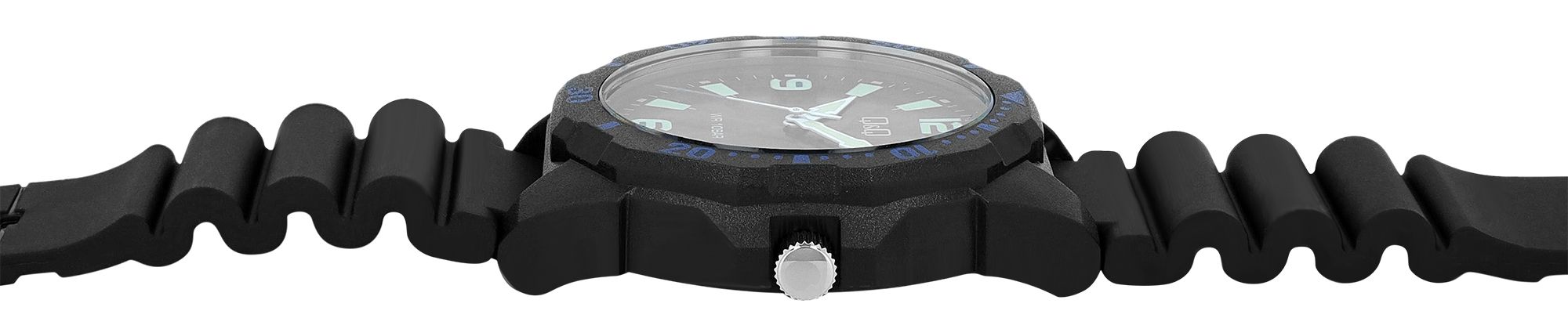 Das robuste Kunststoffgehäuse in Schwarz mit blauen Akzenten verleiht der Uhr ein markantes und sportliches Äußeres, während der Edelstahl-Gehäuseboden für zusätzliche Stabilität sorgt. Mit einem Gehäusedurchmesser von 43 mm und einer Gehäusehöhe von 12 mm ist diese Herrenuhr markant und dennoch angenehm zu tragen. Das 24,5 mm breite Silikonarmband ist flexibel und bequem für den aktiven Lebensstil.