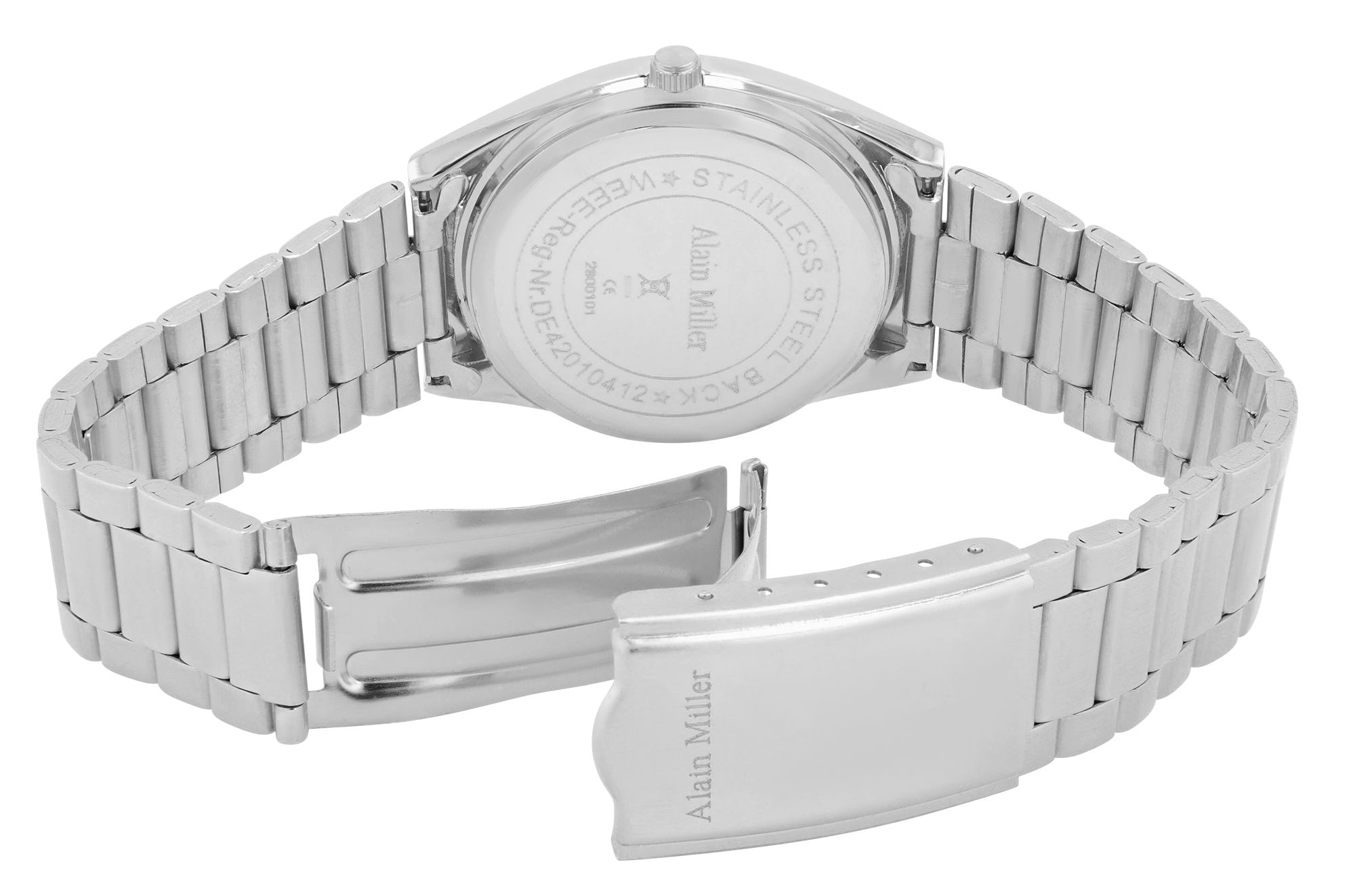 Het Alain Miller horloge maakt indruk met een metalen schakelarmband en een totale lengte van 23,5 cm. Met een bandbreedte van 20 mm bij de brug en een praktische vouwsluiting is het horloge gemakkelijk om- en af te doen. Het hoogwaardige quartz uurwerk zorgt voor betrouwbare precisie, zodat je altijd op je horloge kunt vertrouwen. De robuuste metalen kast met een diameter van 36,5 mm wordt aangevuld met een roestvrijstalen achterkant, die zorgt voor een lange levensduur van het horloge en een betere huidverdraagzaamheid. De wijzerplaat is voorzien van een stickindex, lichtgevende wijzers en een praktische datumweergave en is gemakkelijk af te lezen.