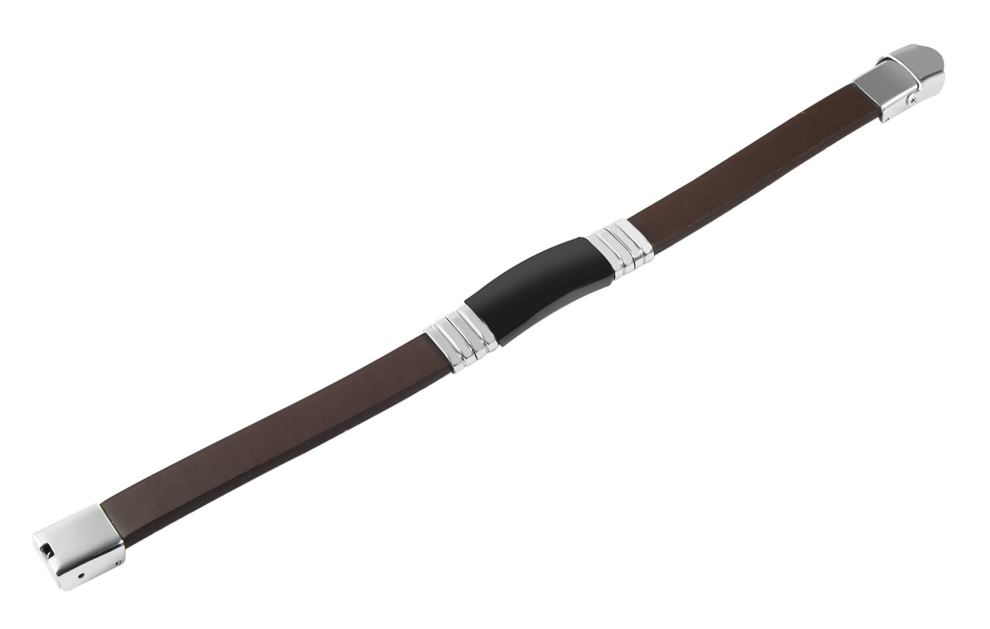 Das Echtlederarmband der Marke Akzent besteht aus einem 10 mm breiten, glatten Lederriemen. Mittig ist ein 2,9 cm langes schwarzes Edelstahlelement eingearbeitet. Dieses ist mit jeweils vier silberfarbene ovalen Edelstahlringen umrandet. Diese runden das harmonische Gesamtbild des modischen Schmuckarmbandes ab. Öffnen und schließen lässt sich das Armband mit einem silberfarbenen glänzenden Hakenverschluss. Die Gesamtlänge des Schmuckstückes beträgt 21 cm, die Breite der Gravurplatte 13 mm und die Materialstärke 8 mm.