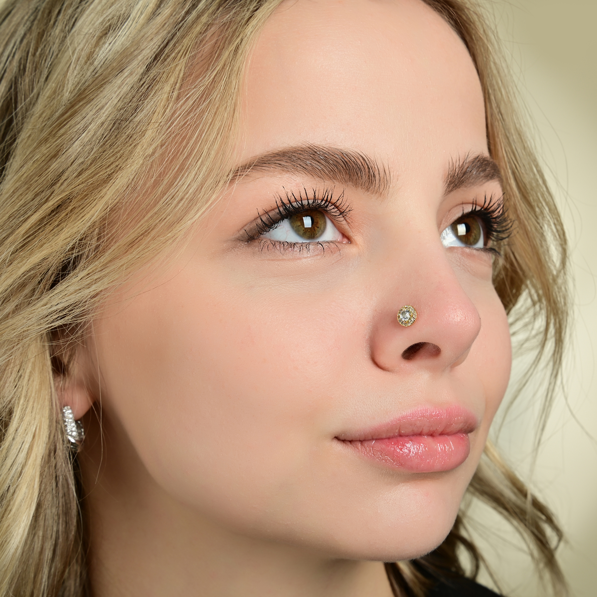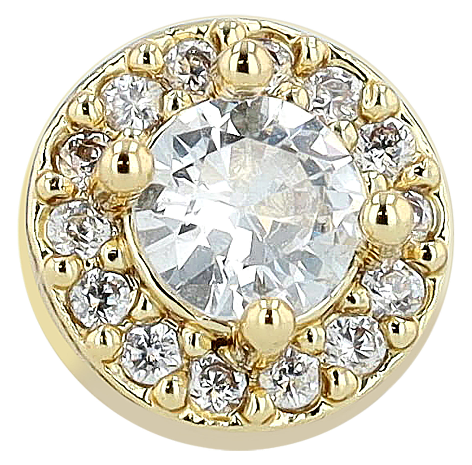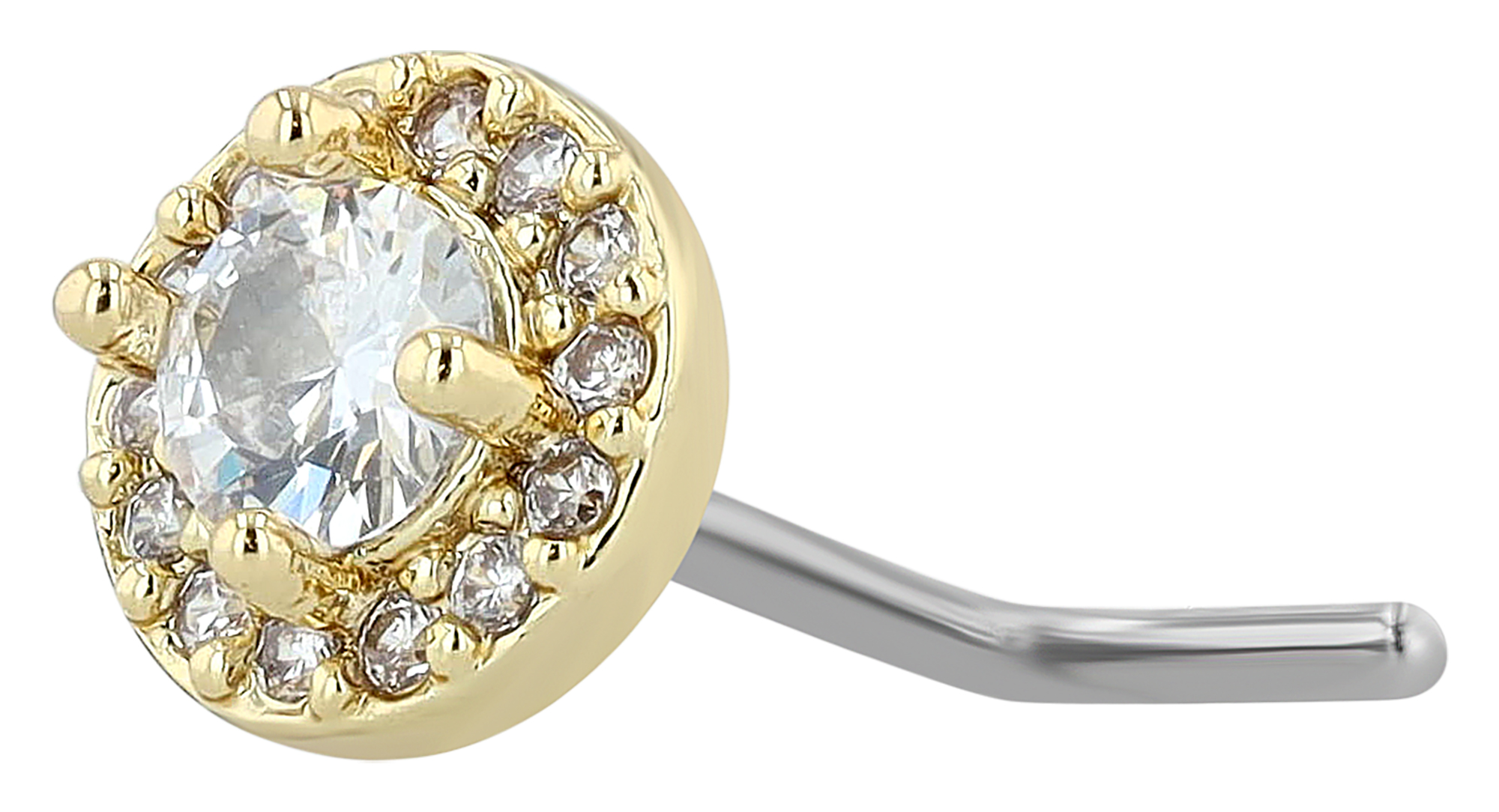 Der runde Stecker mit einem Durchmesser von 6 mm und einer Höhe von 4 mm. Verziert mit einem funkelnden Zirkon (Ø 3 mm), der von einer klassischen 4-Krappenfassung gehalten wird, zieht dieses Piercing alle Blicke auf sich. Der zentrale Stein wird zusätzlich von 14 kleineren Zirkonen umrahmt, die ihm ein strahlendes Funkeln verleihen. Die L-Form ist bei Nasenpiercings wegen seinem sicheren Halt und dem einfachen einsetzen und herausnehmen eine beliebte Variante.