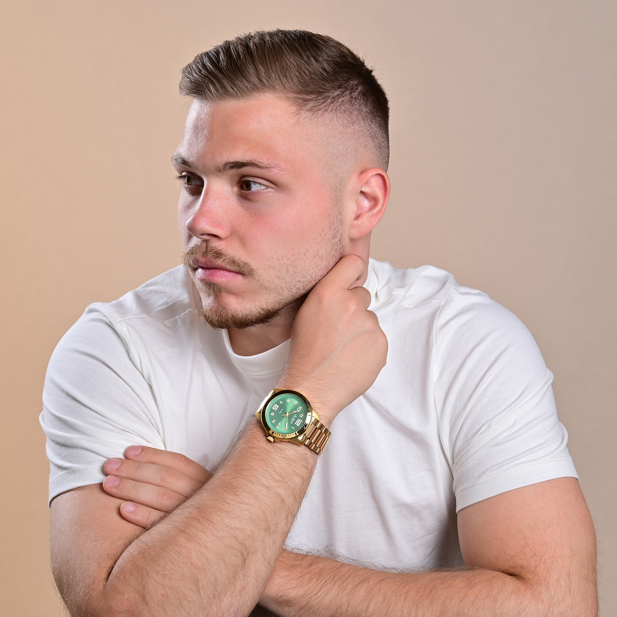 Productinformatie "JUST Herrenuhr "Roman" mit Edelstahlband, Ø 43 mm, 10 ATM, goldfarben/ grün"